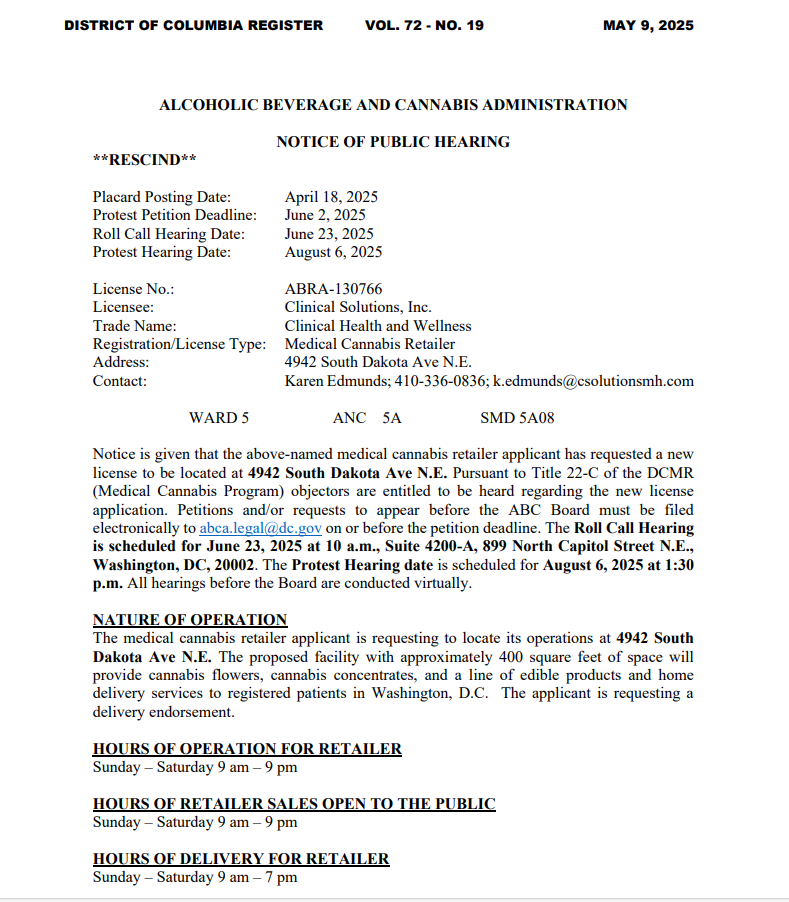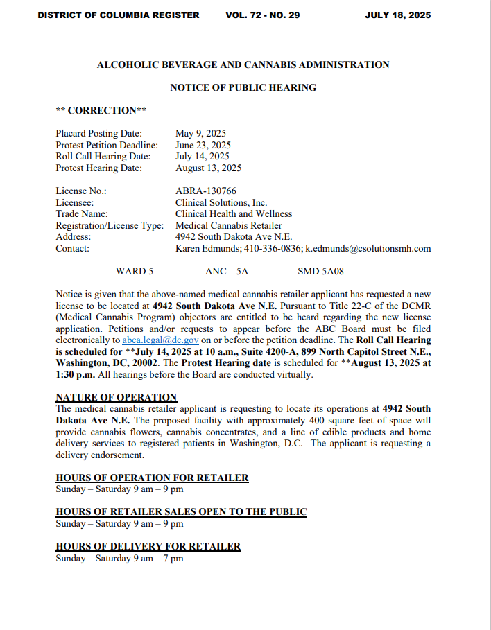 On July 14, 2025, the Alcoholic Beverage & Cannabis Administration (ABCA) held a roll call hearing on the application of Clinical Health & Wellness to open a medical cannabis shop at 4942 South Dakota Avenue NE in North Michigan Park. The property sits in ANC 5A08. ANC Commissioner Elaine Alston (5A08) represented the ANC at the roll call hearing.