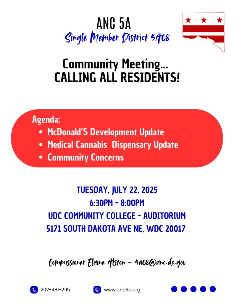 The property sits in ANC 5A08. Residents may direct questions to ANC Commissioner Elaine Alston (5A08) at 5A08@anc.dc.gov or (202) 481-2115.
