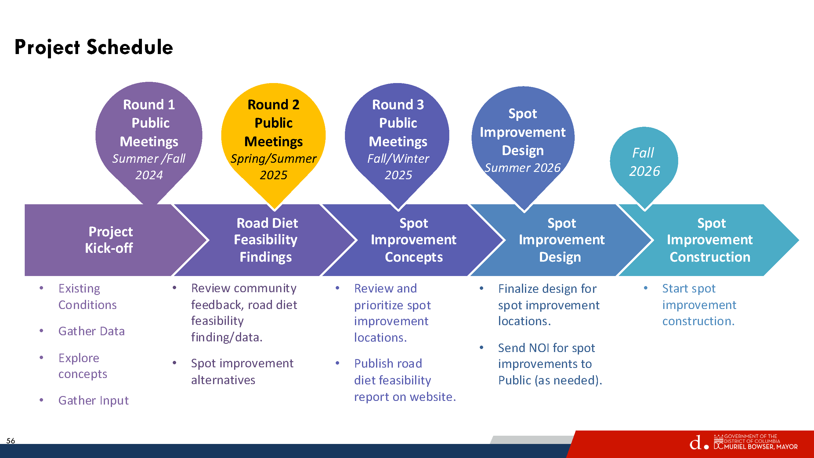 DDOT will have a another meeting to review and prioritize spot improvement locations. Once the locations are selected, DDOT will finalize design and issue Notices of Intent (NOIs) before installing any treatment. DDOT expects to start spot improvement construction in fall 2026.