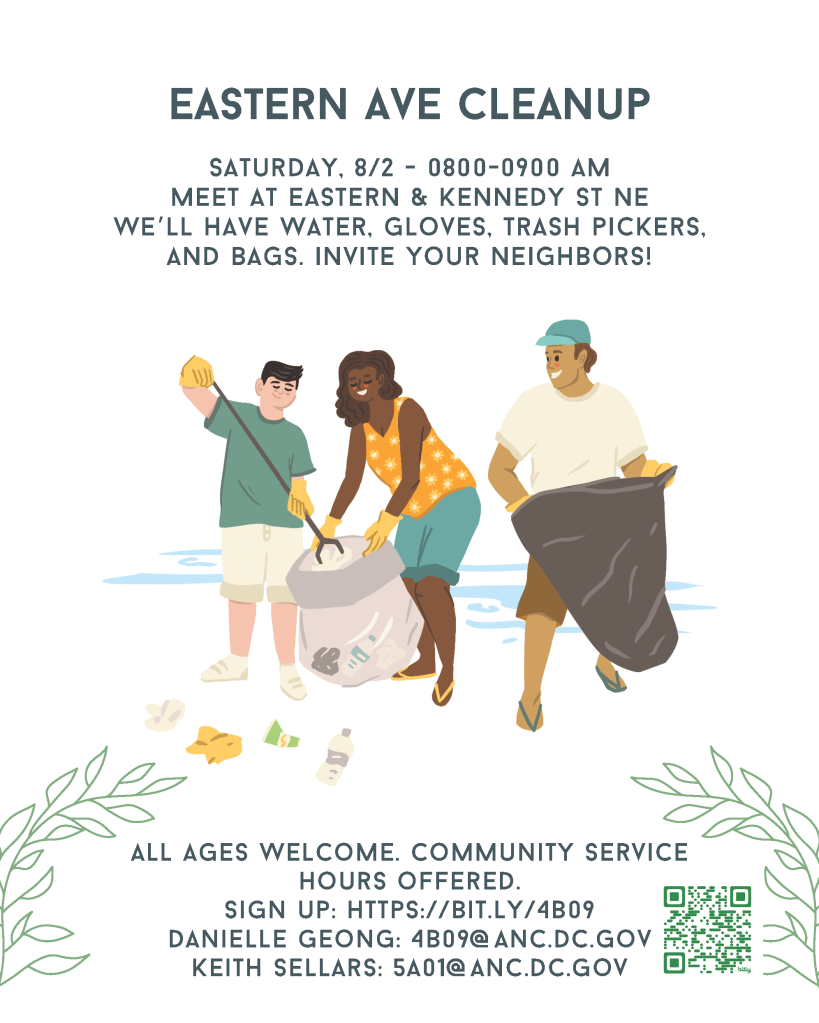 Join ANC Commissioners Danielle Geong (4B09) & Keith Sellars (5A01) for a neighborhood clean up along Eastern Avenue on Saturday, August 2, 2025, from 8:00 am to 9:00 am.