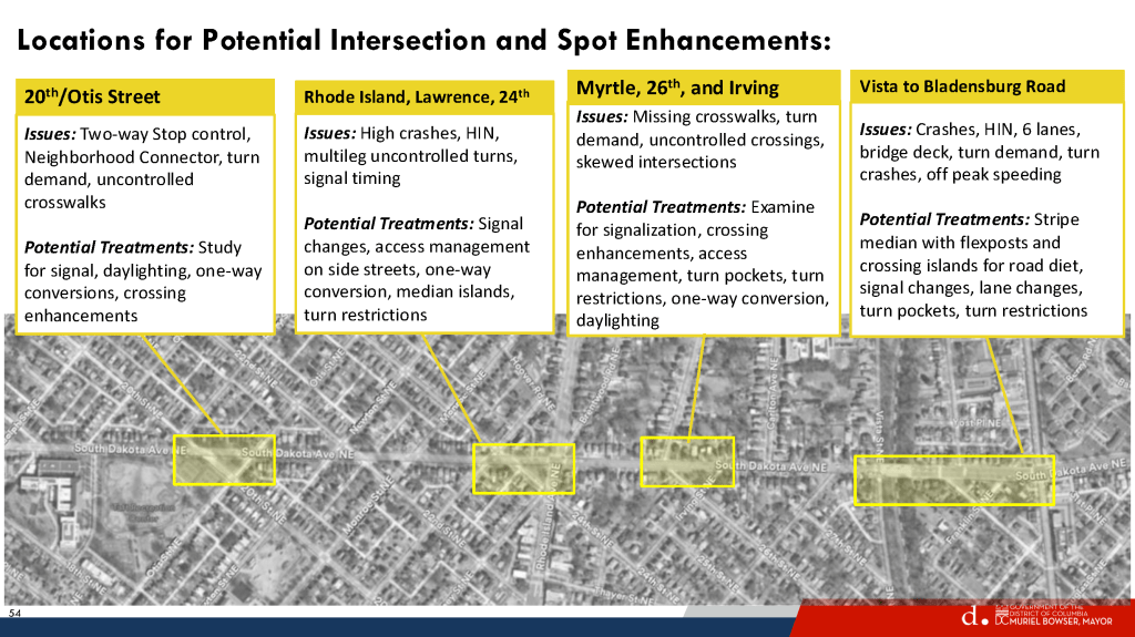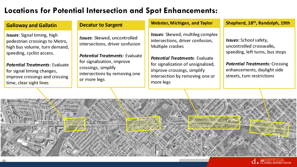 As ranked by number of comments received, the number one and number two locations of concern were (1) South Dakota & Galloway and (2) South Dakota and Riggs. But DDOT does not plan to address South Dakota & Riggs any time soon. A DDOT representative first told me it is not part of Ward 5 (it partially is) and then they said that Riggs needs its own corridor study and that “we need to talk to our councilmember,” referring to the Ward 4 councilmember.