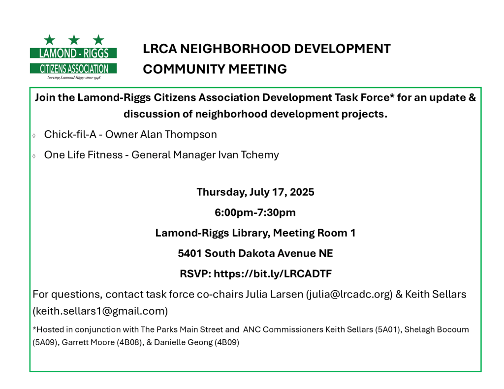 * Hosted in conjunction with The Parks Main Street and ANC Commissioners Keith Sellars (5A01), Shelagh Bocoum (5A09), Garrett Moore (4B08), & Danielle Geong (4B09).