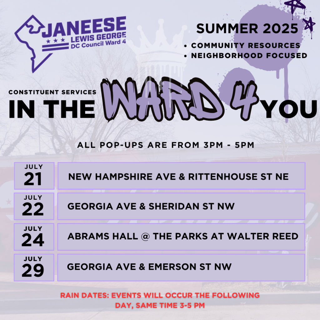 Ward 4 Councilmember Janeese Lewis George is holding a constituent services pop up today, July 21, from 3 pm to 5pm at New Hampshire Avenue & Rittenhouse Street NE. Stop by to get your community concerns addressed by the Ward 4 team.