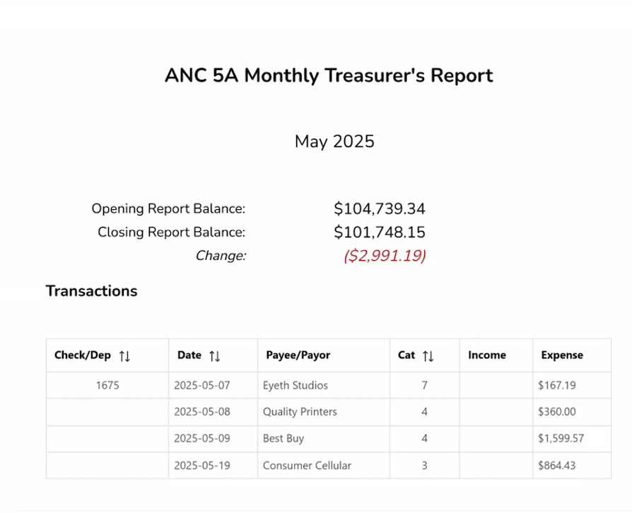 ANC 5A held its monthly public meeting on June 25, 2025. Commissioners present: Keith Sellars (5A01); Timothy Thomas (5A02) – Vice Chair; Emily Singer Lucio (5A03) – Chair; Jack Hermes (5A04) – Parliamentarian; Derrick Holloway (5A06); Valeria Sosa Garnica (5A07); Elaine Alston (5A08); Shelagh Bocoum (5A09) – Treasurer. ANC 5A05 is vacant.