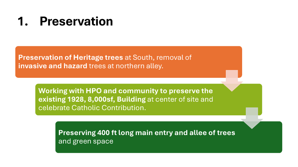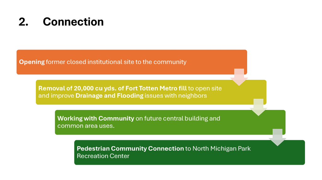 They plan to open up the campus, remove the two mounds of dirt in front, build sidewalks throughout, provide pedestrian access to North Michigan Park Rec, and maintain the large 8,000 square foot building in the center of the campus.