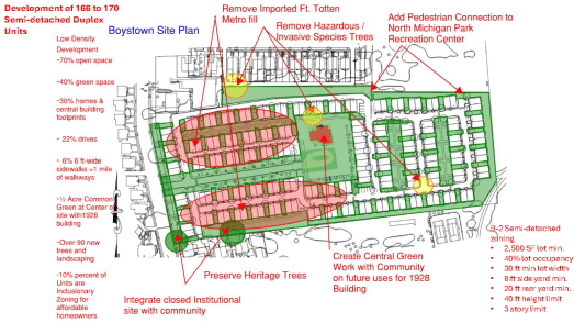 Vicki Davis, founder of Urban Atlantic, presented on the Boys Town campus redevelopment project. The property is located at 4801 Sargent Road NE in North Michigan Park in ANC 5A02. They are planning to build 166-170 duplex homes. Ten percent of the homes (around 17) will be set aside as below market rate homes. Duplexes are permitted as a matter of right in this area, so there will not be a public hearing. Urban Atlantic has to go through a Large Tract Review process by the Office of Planning. We previously discussed that process in this post.