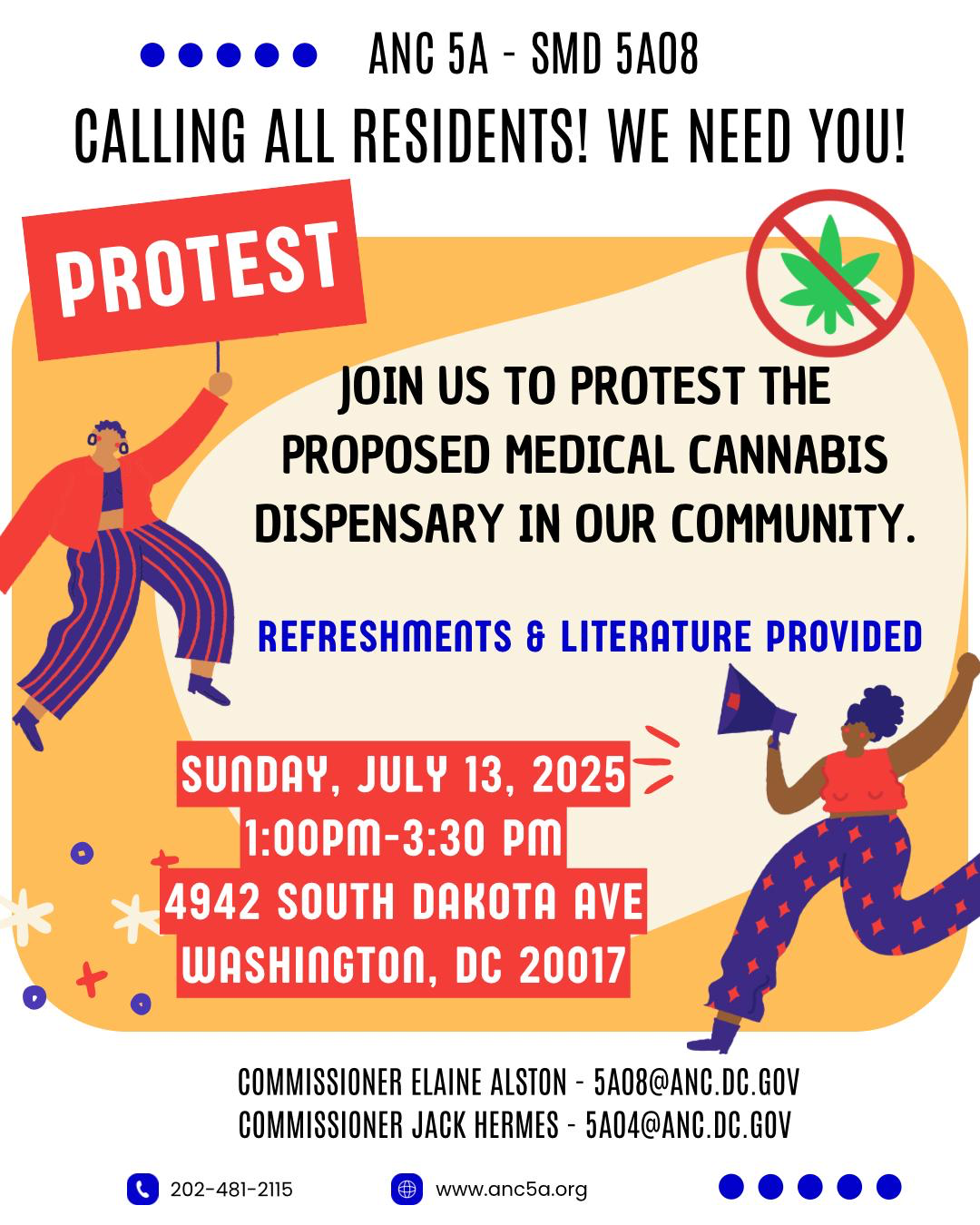 ANC Commissioners Elaine Alston (5A08) and Jack Hermes (5A04) are planning a protest of a potential medical cannabis dispensary looking to open at 4942 South Dakota Avenue NE. The protest will be 1pm-3pm on July 13, 2025. For questions, contact the commissioners at 5A08@anc.dc.gov and 5A04@anc.dc.gov.