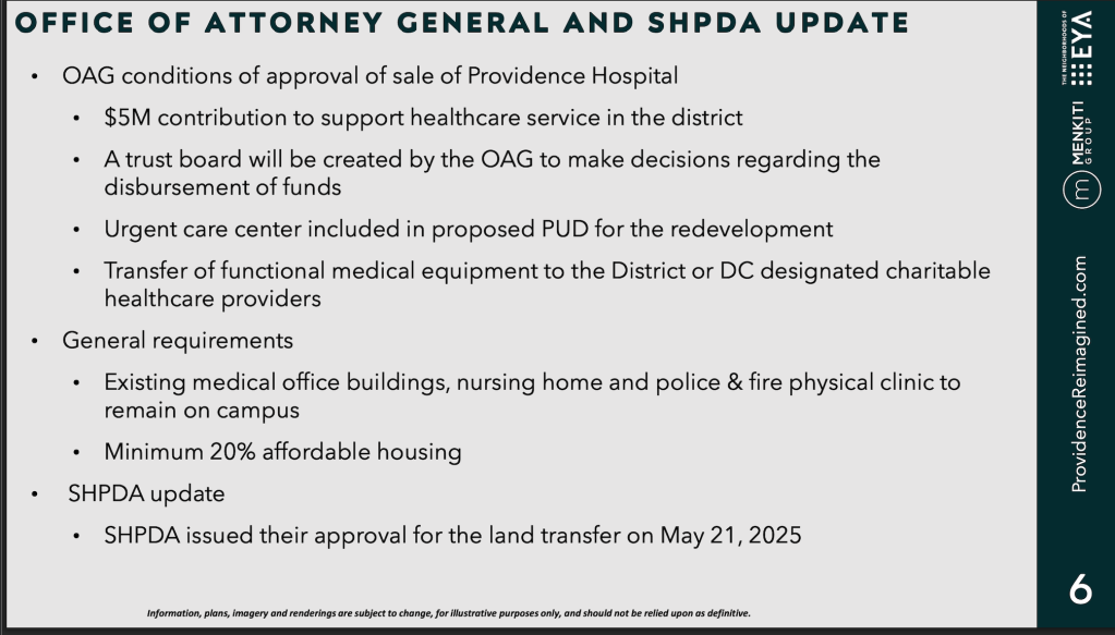 The development team reached an agreement on the value of the land with the Office of Attorney General for DC (OAG), and $5 million will be held in trust for healthcare services. The team is working with the OAG to set up the trust agreement. The OAG will appoint community members to a board to oversee disposition of the funds. An urgent care facility is proposed to be part of the project.