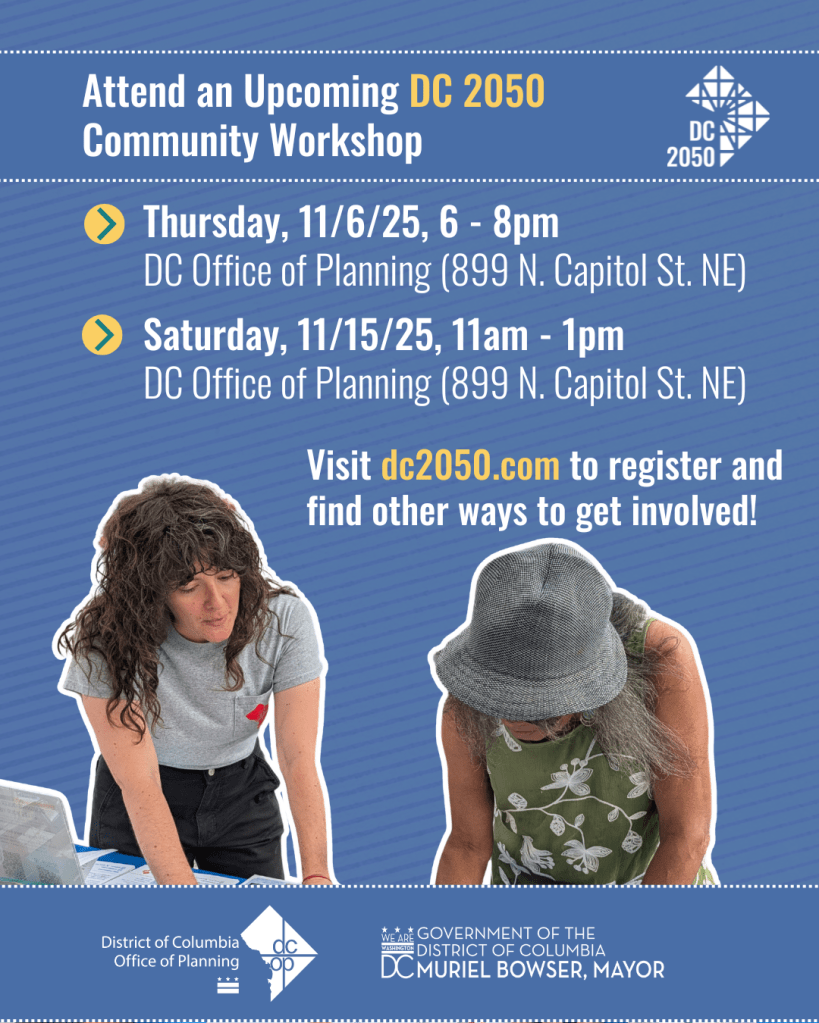 The DC Office of Planning continues to hold community meetings and workshops to gather input for the District’s next Comprehensive Plan, called DC 2050. The Comprehensive Plan guides how the city will grow. There are two upcoming workshops at OP’s offices at 899 North Capitol Street NE: