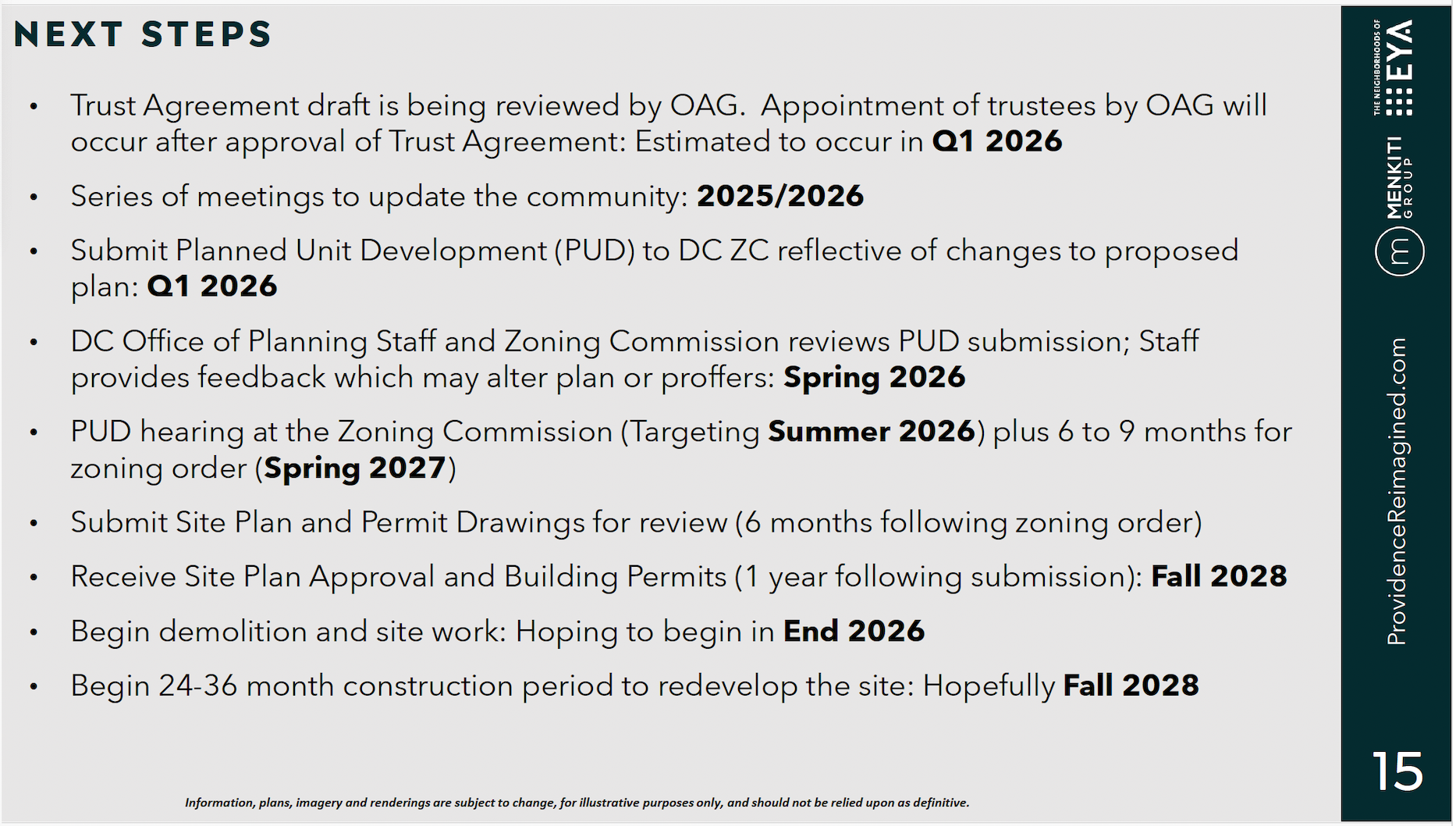 The team expects to submit planned unit development (PUD) documents to the DC Zoning Commission in early 2026.