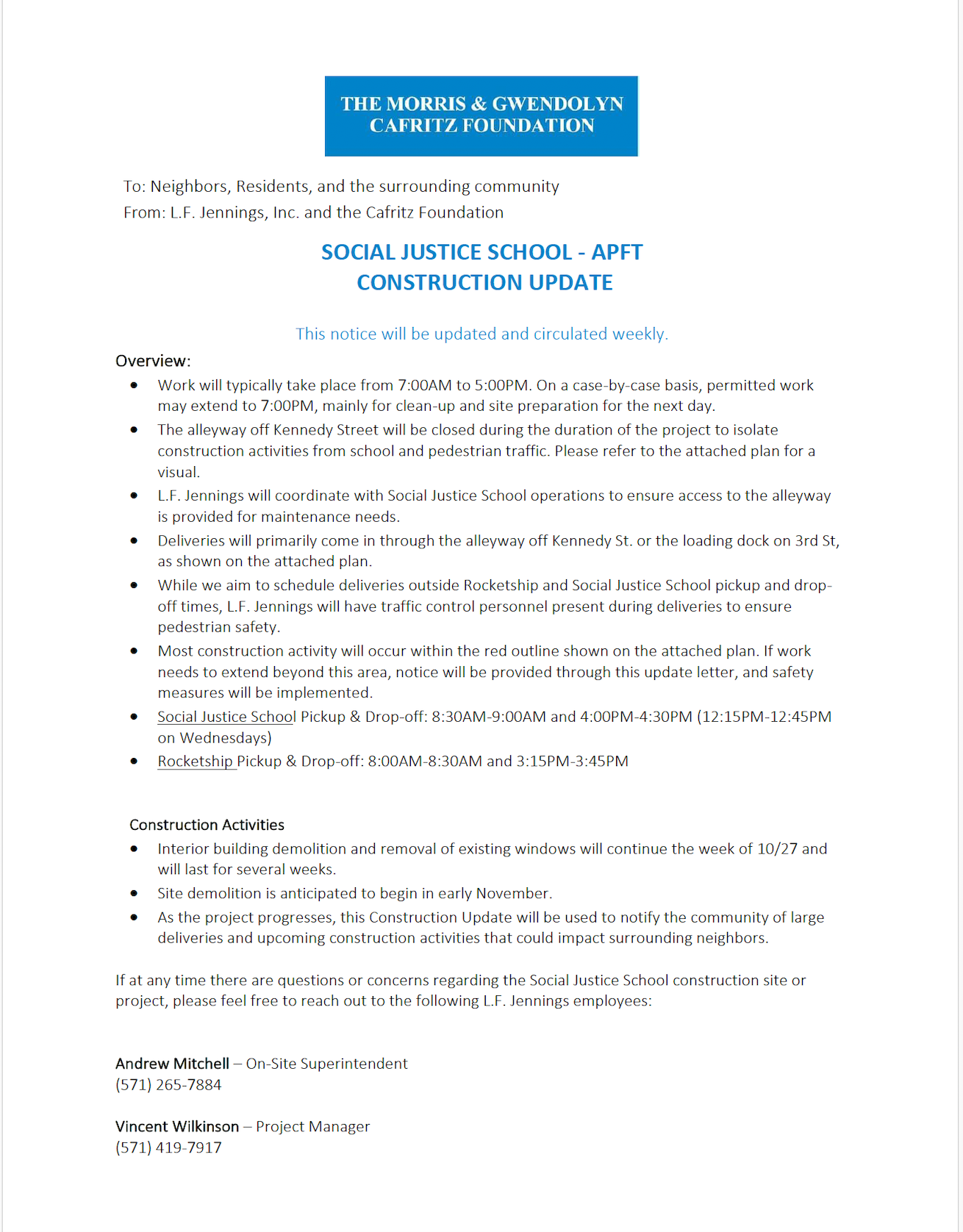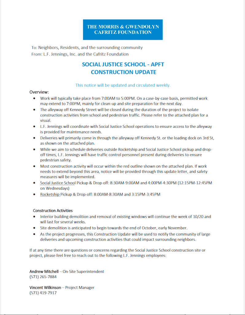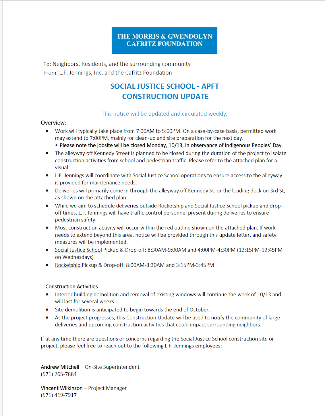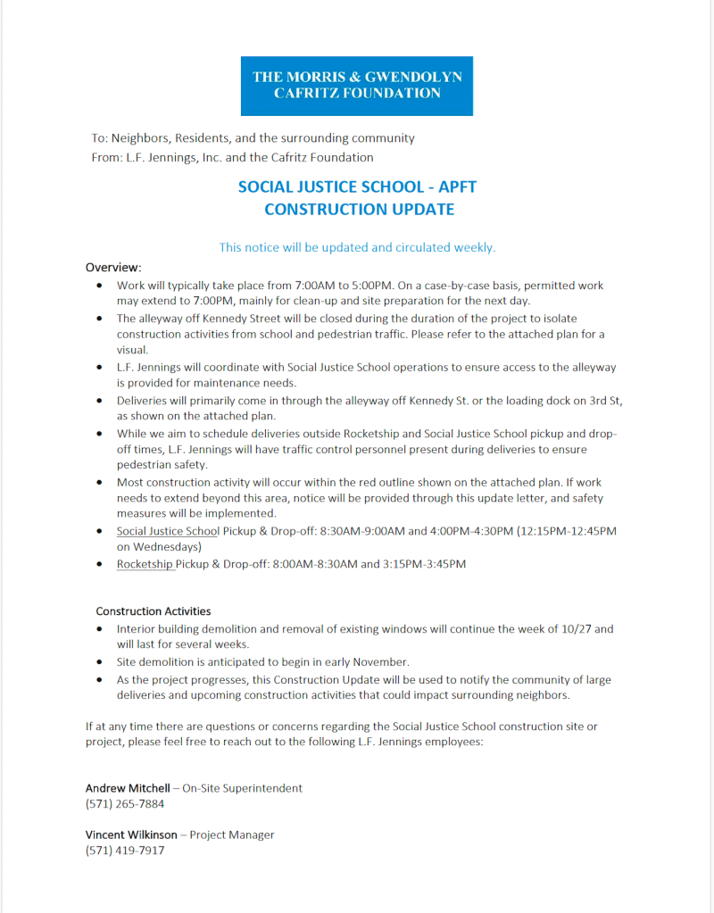 Chair Lucio noted that developers for the Kennedy School redevelopment at 8th & Buchanan Street NE, expect to finish the renovations for what is called the Conway Education Center by the end of this year. Once the renovations are done, the existing school will be torn down to build townhomes. The property borders the Providence campus so Chair Lucio has been working with the different development teams to collaborate on the green spaces between the two properties.