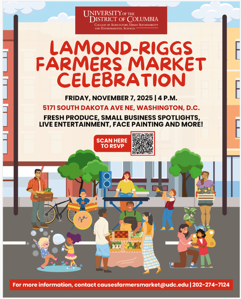 Join UDC CAUSES for their UDC Lamond-Riggs Farmers Market Celebration to celebrate their inaugural market season. Enjoy fresh produce, small business spotlights, live entertainment, face painting, & more!