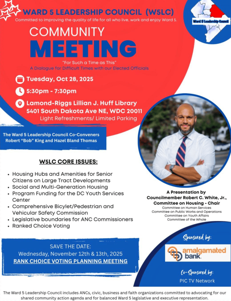 ANC 5A held its monthly public meeting on October 22, 2025. Commissioners present: Timothy Thomas (5A02) – Vice Chair; Emily Singer Lucio (5A03) – Chair; Jack Hermes (5A04) – Parliamentarian; Derrick Holloway (5A06); Valeria Sosa Garnica (5A07) – Secretary; Elaine Alston (5A08); Shelagh Bocoum (5A09) – Treasurer. ANC 5A05 is vacant.