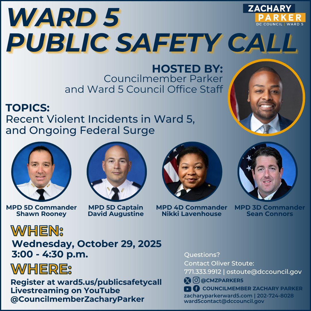 Ward 5 Councilmember Zachary Parker invites residents to join his next Quarterly Public Safety Call on Wednesday, October 29, 2025, at 3:00 p.m.