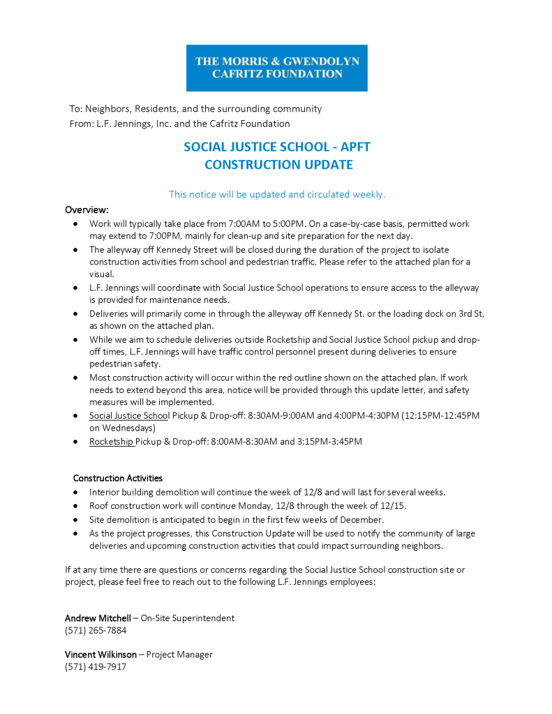Social Justice School APFT Construction Notice 12/8/2025 Posted by nextstoprp in Cafritz Art Place at Fort Totten December 8, 2025 Social Justice School APFT Construction Notice 12/8/2025 Share this: Click to share on X (Opens in new window) X Click to share on Facebook (Opens in new window) Facebook Click to share on X (Opens in new window) X Click to email a link to a friend (Opens in new window) Email Click to print (Opens in new window) Print Like Loading... Related
