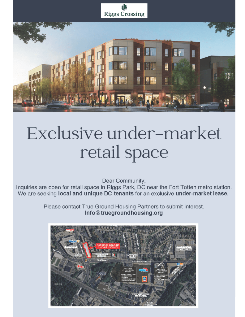 Inquiries are open for retail space in Riggs Park (Riggs Road & South Dakota Avenue NE) near the Fort Totten metro station. The team is seeking local and unique DC tenants for an exclusive under-market lease. Please contact True Ground Housing Partners to submit interest at Info@truegroundhousing.org.