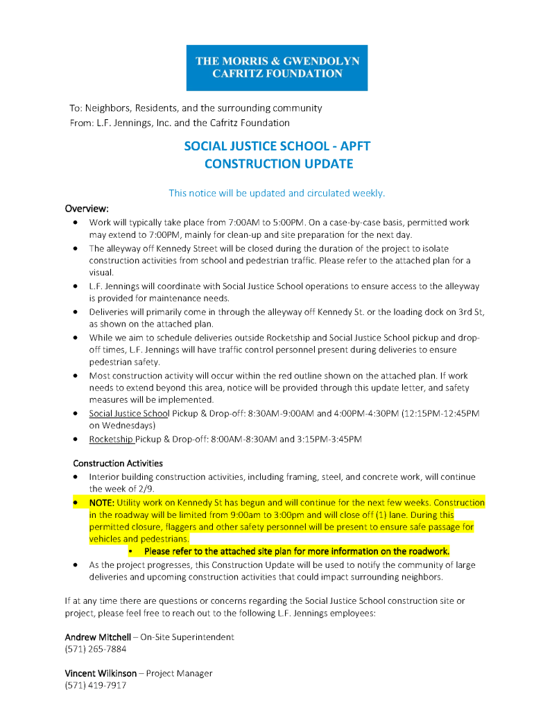 Social Justice School APFT Construction Notice 2/9/2026 Posted by nextstoprp in Cafritz Art Place at Fort Totten February 10, 2026 Social Justice School APFT Construction Notice 2/9/2026 Share this: Share on X (Opens in new window) X Share on Facebook (Opens in new window) Facebook Share on X (Opens in new window) X Email a link to a friend (Opens in new window) Email Print (Opens in new window) Print Like Loading... Related