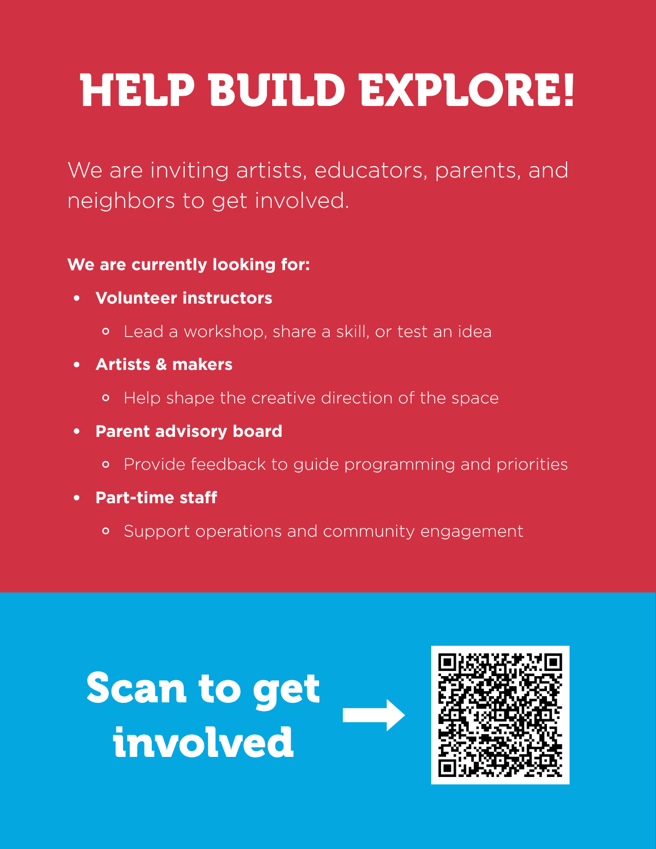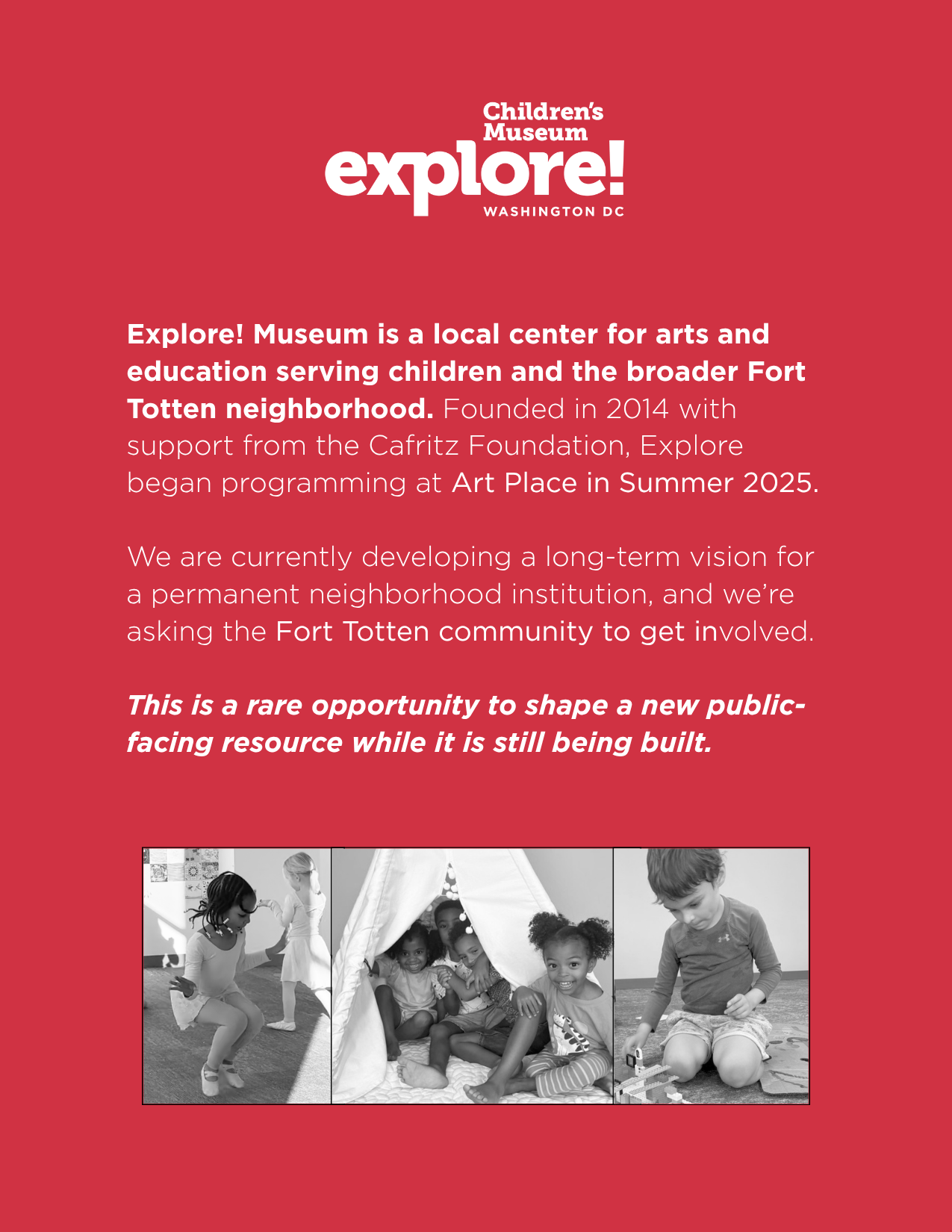 Explore! Museum began offering pilot programming at Art Place at Fort Totten in summer 2025. Now they are inviting artists, educators, parents, and neighbors to get involved to help develop a long-term vision for the permanent community institution. They are looking for:
