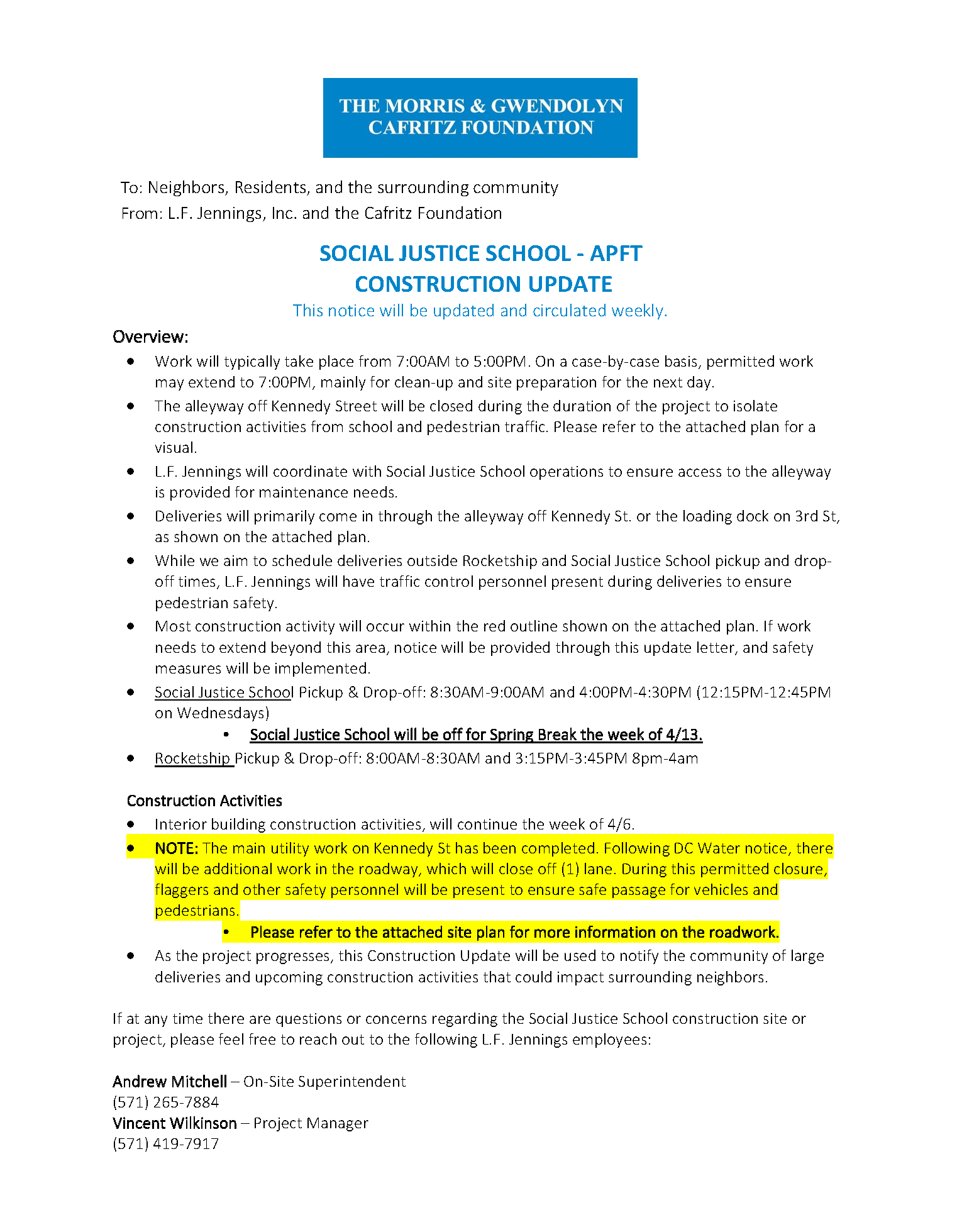 Social Justice School APFT Construction Notice 4/13/2026