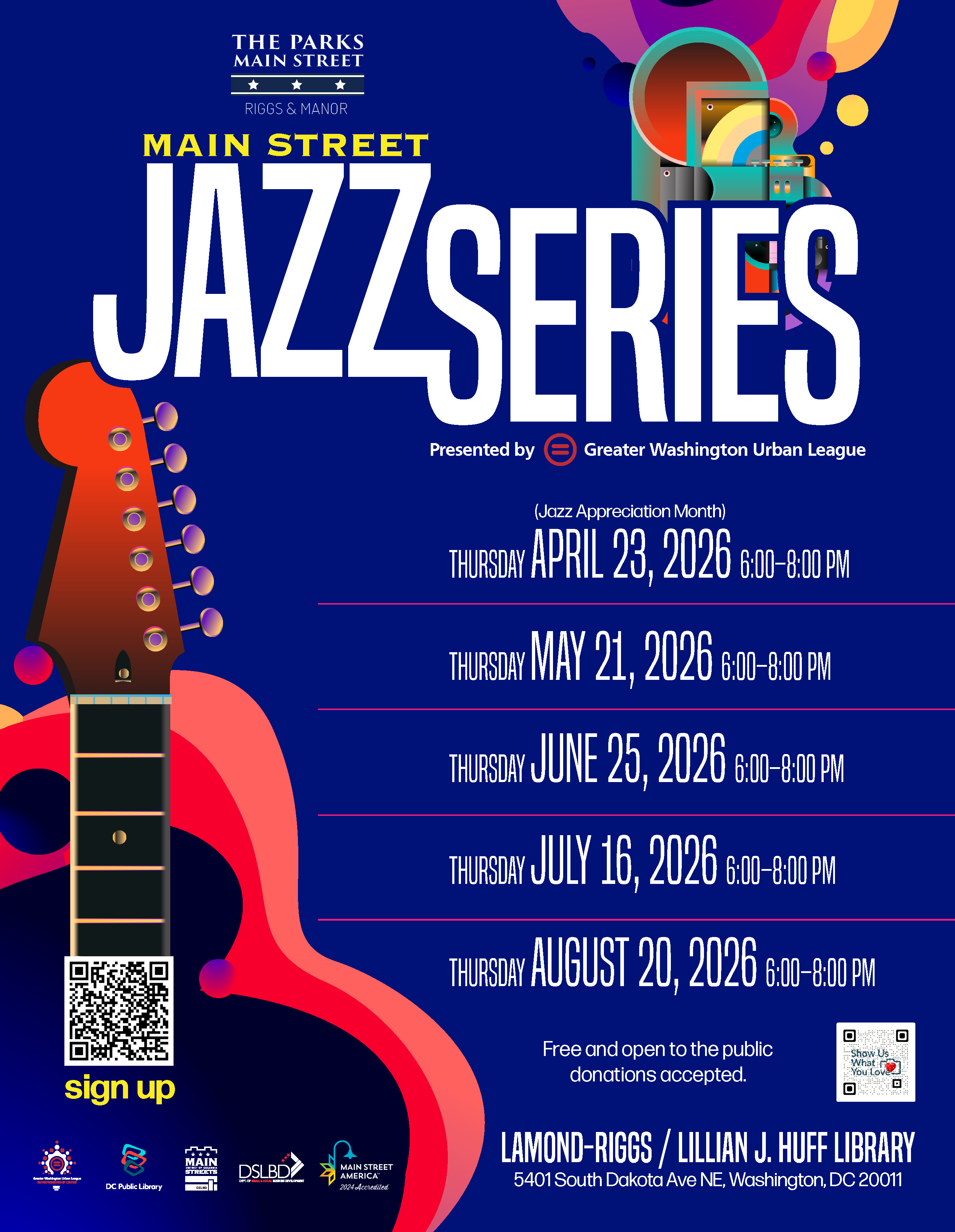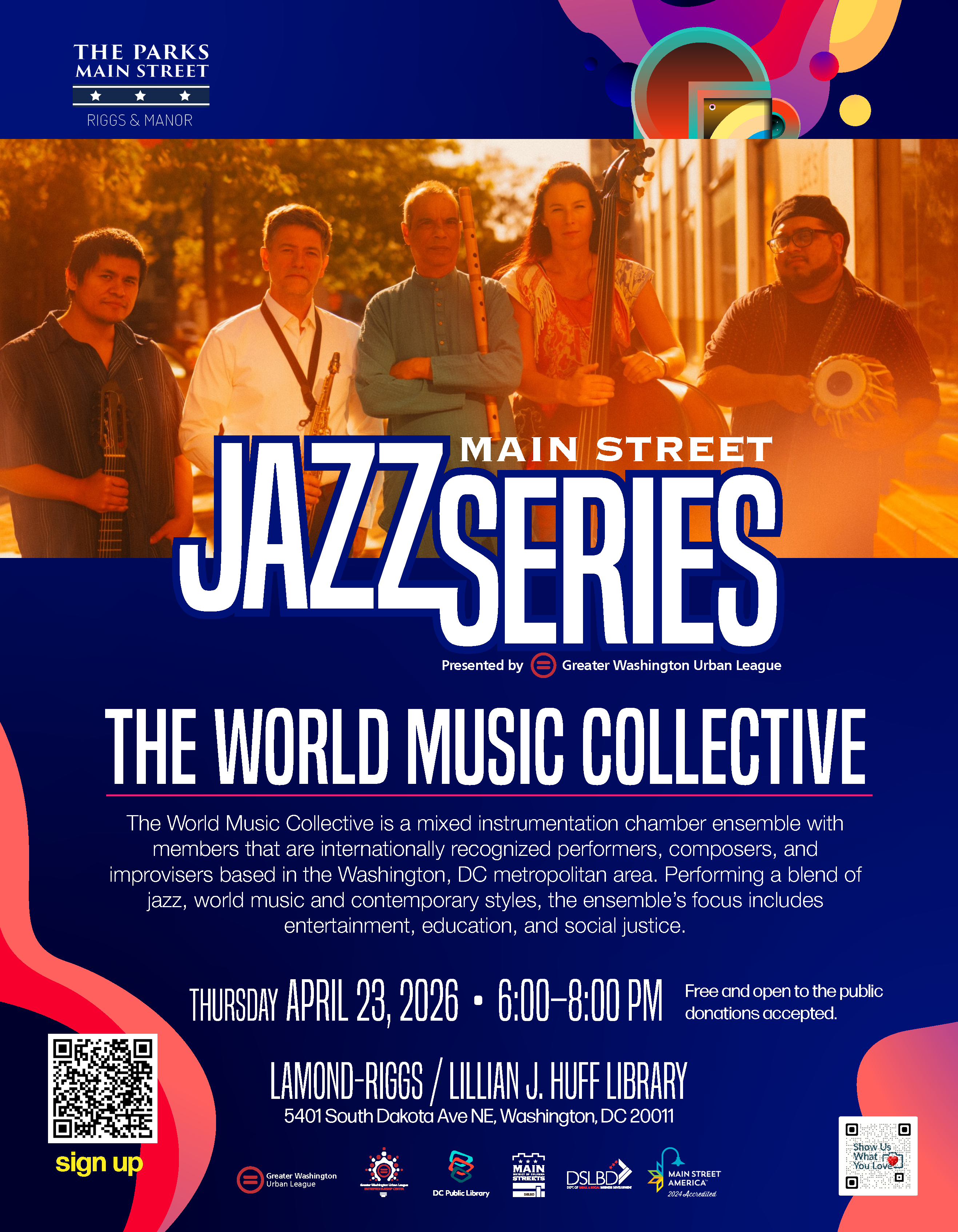 The 2026 Main Street Jazz Series kicks off with The World Music Collective on April 23 at 6pm at the Lamond-Riggs Library.