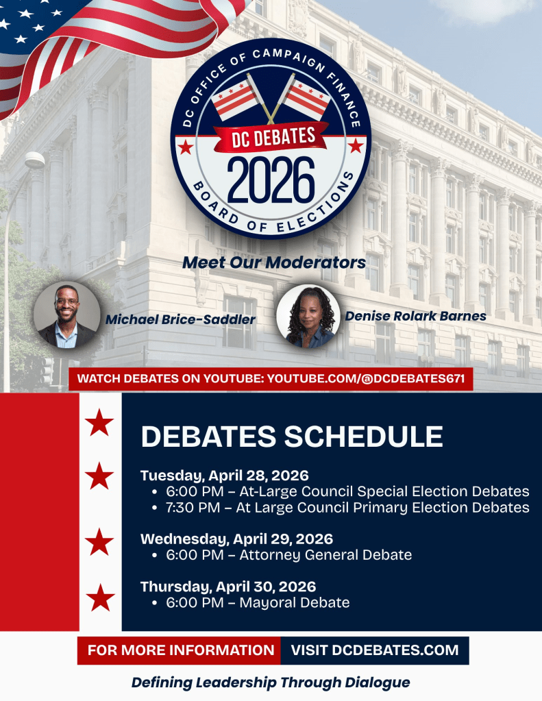 Candidates who participate in DC’s public campaign finance program must participate in a public debate hosted by DC’s Office of Campaign Finance.