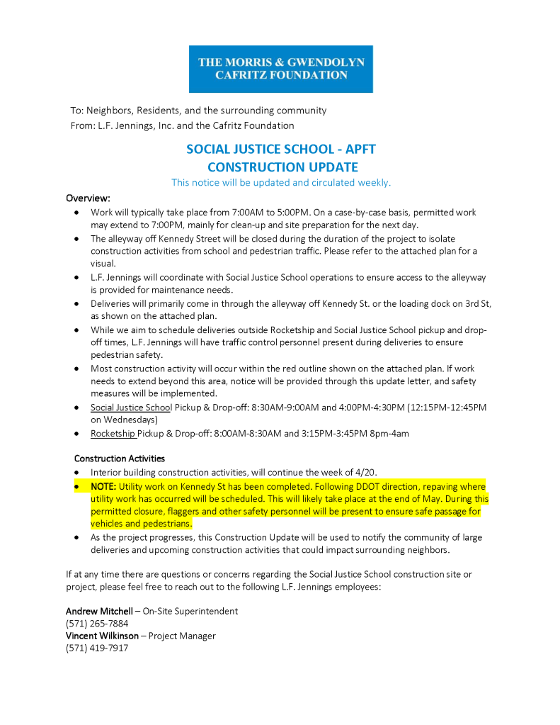 Social Justice School APFT Construction Notice 4/27/2026 Posted by nextstoprp in Cafritz Art Place at Fort Totten April 27, 2026 Social Justice School APFT Construction Notice 4/27/2026 Share this: Share on X (Opens in new window) X Share on Facebook (Opens in new window) Facebook Share on X (Opens in new window) X Email a link to a friend (Opens in new window) Email Print (Opens in new window) Print Like Loading... Related