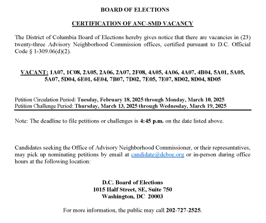 Nominating petitions for vacant ANC 4B and ANC 5A seats will be available starting February 18, 2025. They will be due by 4:45 pm on March 10, 2025. Instructions on running for vacant ANC seats are on the DC Board of Elections website.