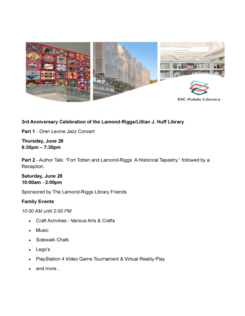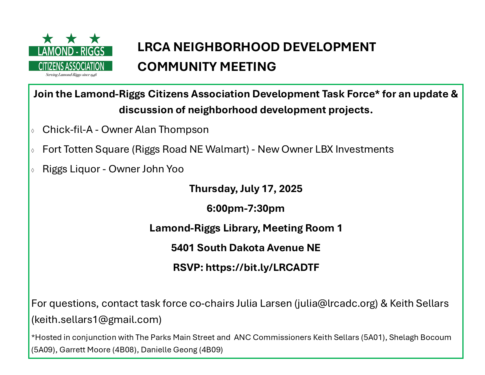 • The Lamond-Riggs Citizens Association (LRCA) meets at 6:00 pm the 1st Monday of each month from October to June.