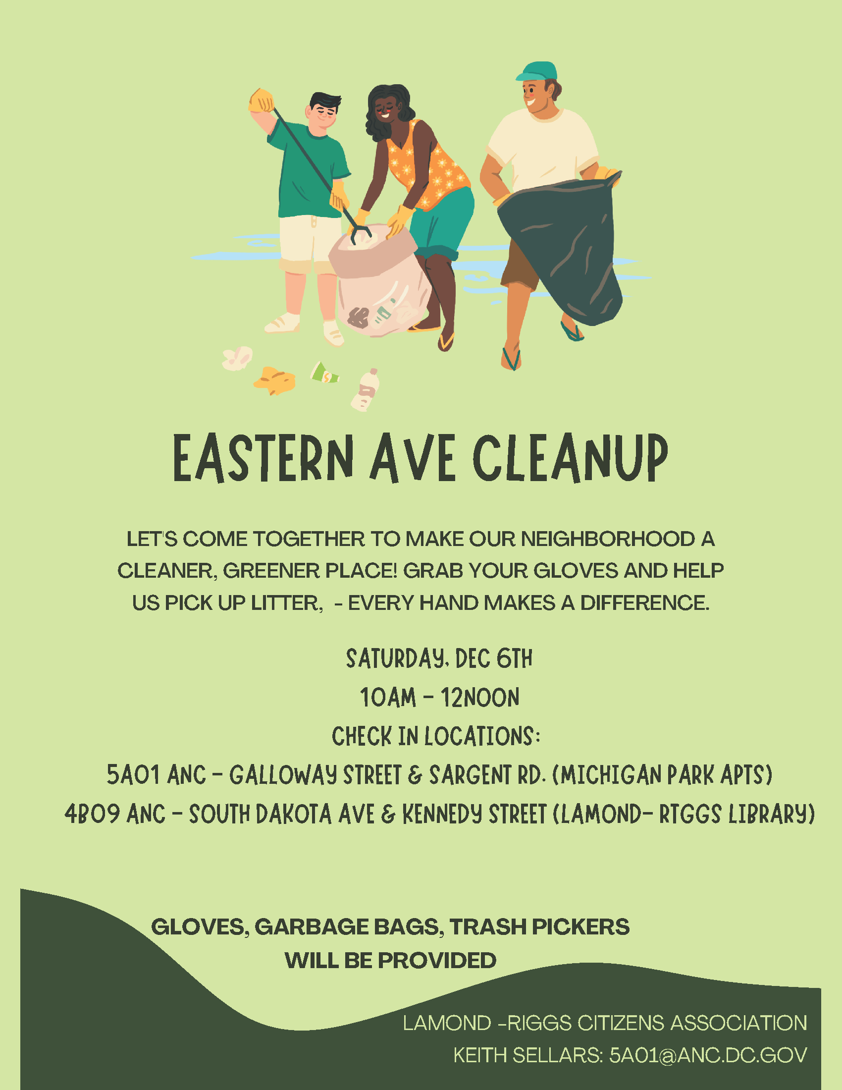 Join ANC Commissioners Keith Sellars (5A01), Danielle Geong (4B09), and the Lamond-Riggs Citizens Association for a neighborhood clean up along Eastern Avenue NE!