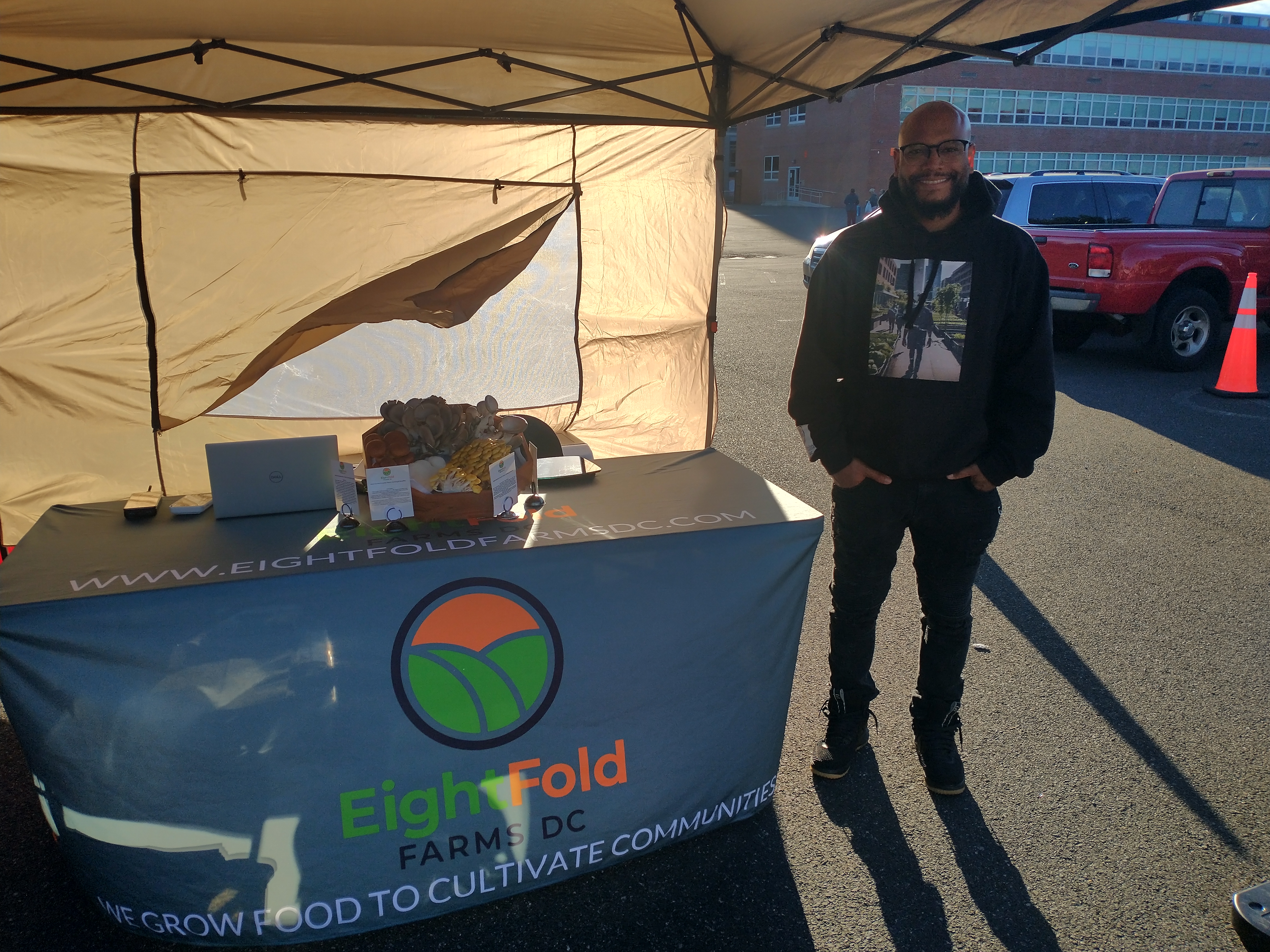 Eightfold Farms by owner J.R. Hines, a vendor at the market, is billed as DC’s first commercial mushroom farm. Mr. Hines received a federal grant with support from UDC CAUSES to support his concept. The business provides CSA dropoffs, supplies mushrooms to local restaurants, and also provides nutrition education/financial literacy to DCPS students.