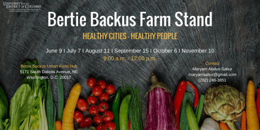 The Bertie Backus farmstand is returning this season! Last summer’s inaugural farmstand held monthly at UDC-CC Backus (5171 South Dakota Avenue NE) was a big success so UDC is seeking to expand the offerings and frequency. This year, the farmstand will be held twice per month on the second and fourth Saturdays of each month June through November.