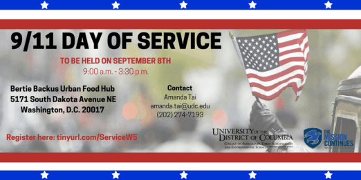The College of Agriculture, Urban Sustainability and Environmental Sciences (CAUSES), of the University of the District of Columbia (UDC), is partnering with The Mission Continues for the 2nd Annual 9/11 Day of Service. This year’s service day will take place on September 8th at UDC’s Bertie Backus Urban Food Hub, located in Ward 5. The food hub has aquaponic and hydroponic systems, a native plant nursery and garden beds for the community.