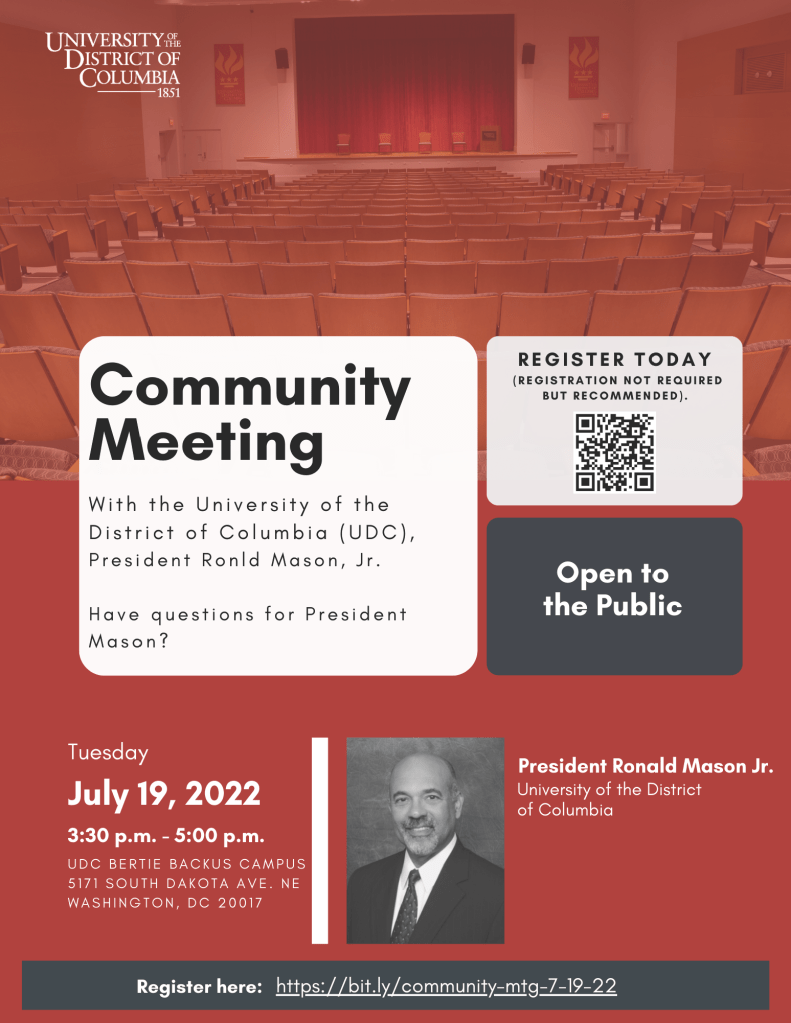 The University of the District of Columbia (UDC) will be hosting an in-person Community Meeting with University President Ronald Mason Jr. for residents near the UDC Bertie Backus Campus on Tuesday, July 19, 2022, from 3:30 pm to 5:00 pm in Room 303. This is your chance to speak with President Mason directly in an informal setting about anything related to the Backus campus.