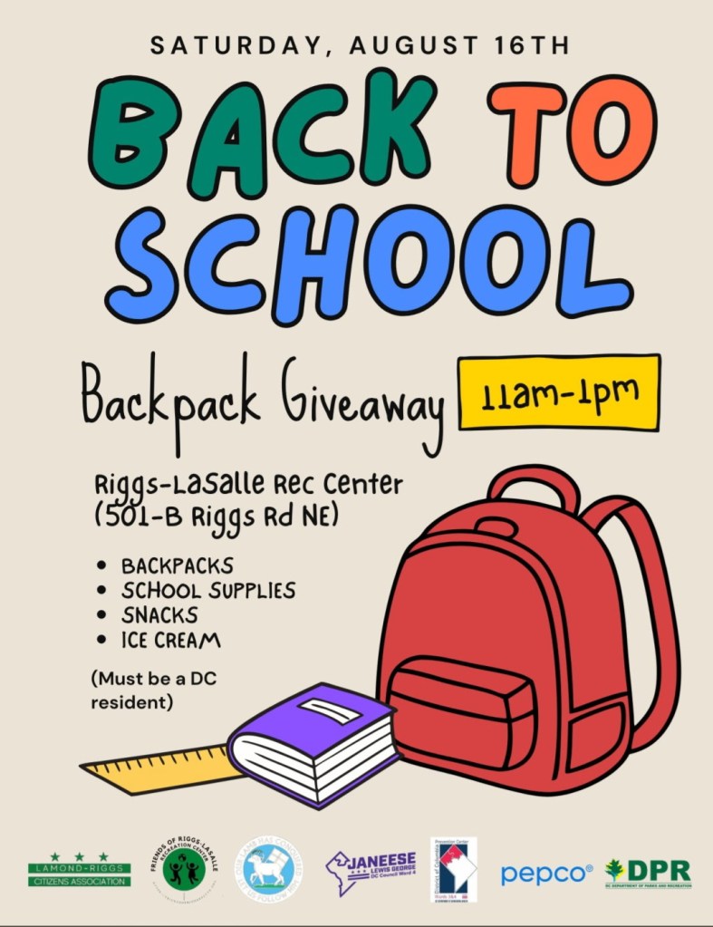 On August 16, 2026, 11am-1pm, the Friends of Riggs-LaSalle Rec is holding a backpack giveaway at Riggs-LaSalle Rec, 501 Riggs Road NE. Must be a DC resident.