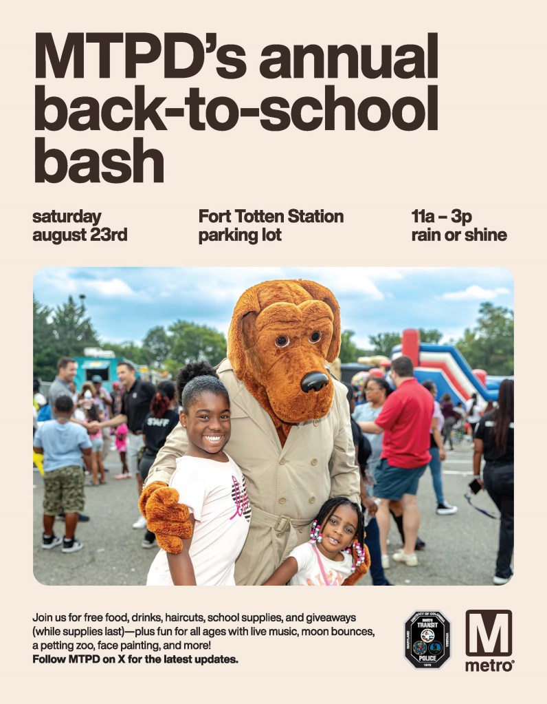 On August 23, 2025, 11am-3pm, the Metro Transit Police Department is holding its annual back to school bash at Fort Totten station, large parking lot. Enjoy free food, drinks, haircuts, school supplies, live music, and giveaways.