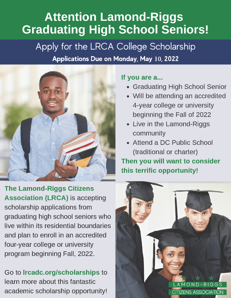 The Lamond-Riggs Citizens Association is accepting scholarship applications from graduating high school seniors who reside in Lamond-Riggs, attend a DC public school (traditional or charter), and who will attend college full-time in the fall. The application and guidelines are available at http://www.lrcadc.org/scholarships.