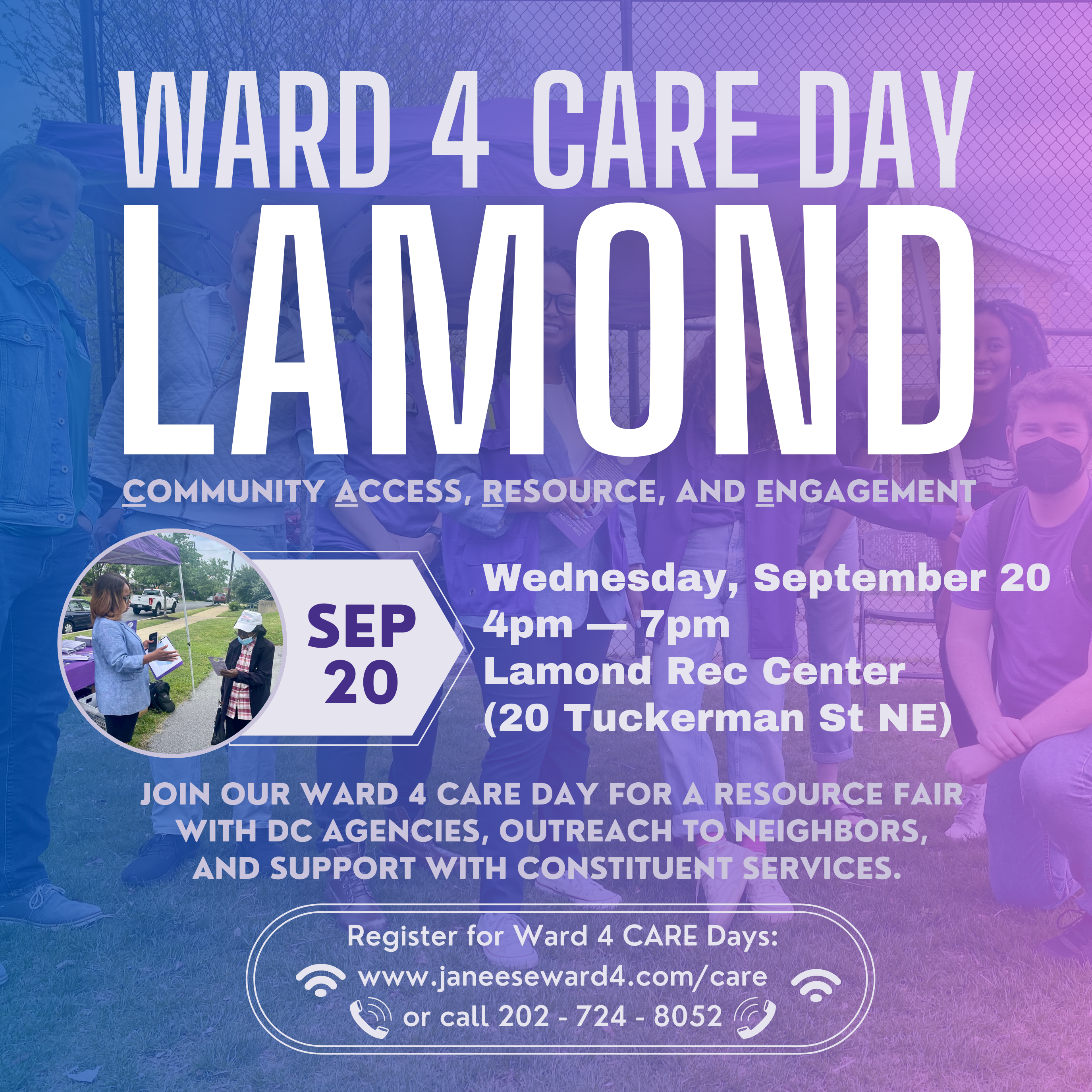 Community Access, Resource & Engagement (CARE) Days will provide Ward 4 residents an opportunity to learn how their government is helping Ward 4 communities stay safe and vibrant. These events will encourage resident-centered conversation aimed at equipping residents with resources to directly engage DC agencies, services, and community groups to address the unique issues in their unique neighborhoods.