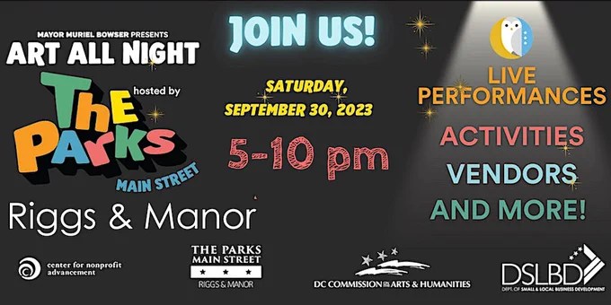 Art All Night hosted by The Parks Main Street (TPMS) returns to the Riggs Park and Manor Park neighborhoods on September 30, 2023.