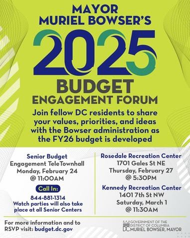 Mayor Muriel Bowser will be holding budget forums for development of the Fiscal Year 2026 budget. Also, take a few minutes to share your budget priorities online: FY26 Budget Priorities Survey. This is an opportunity to ask for what you want.