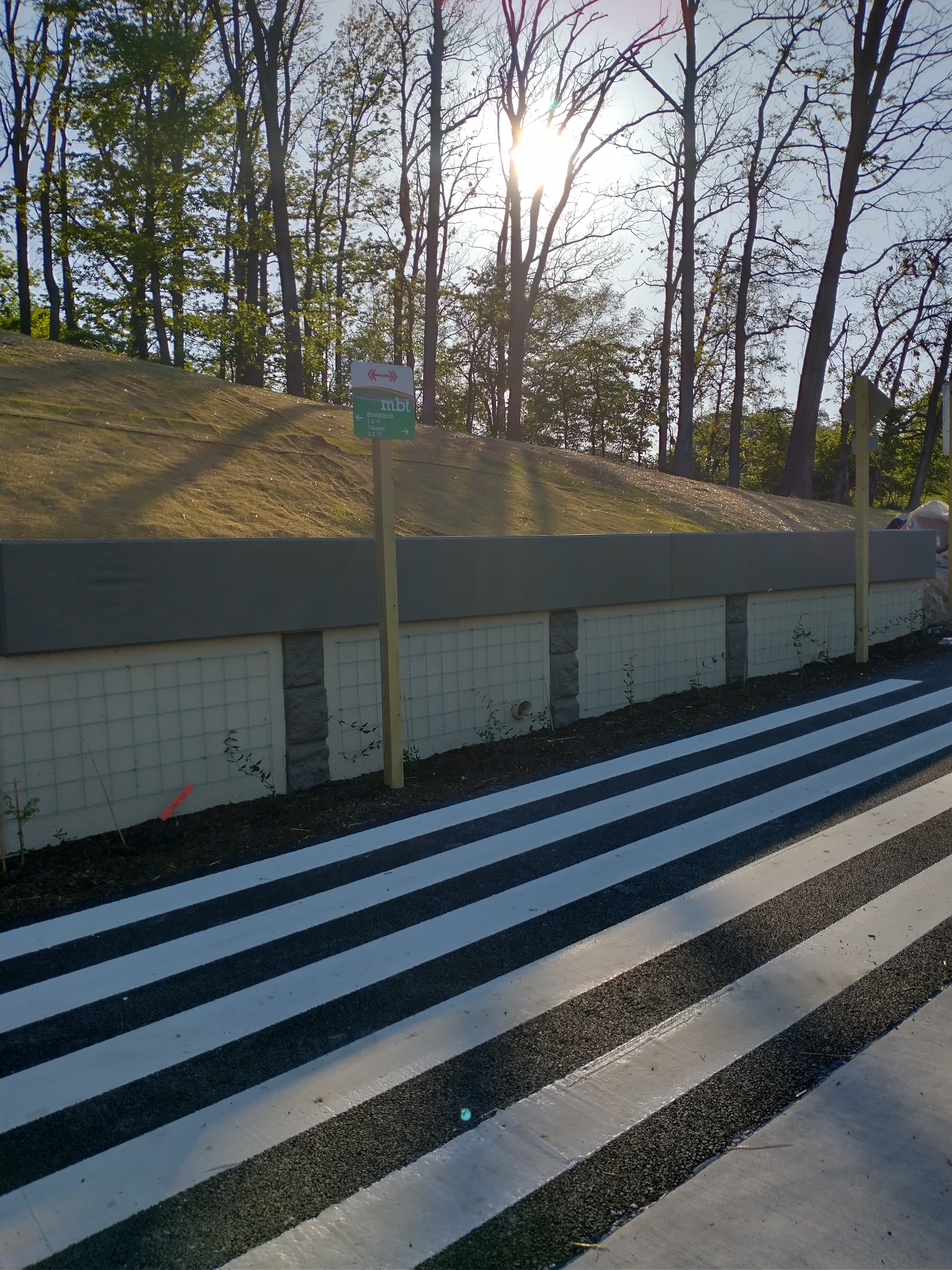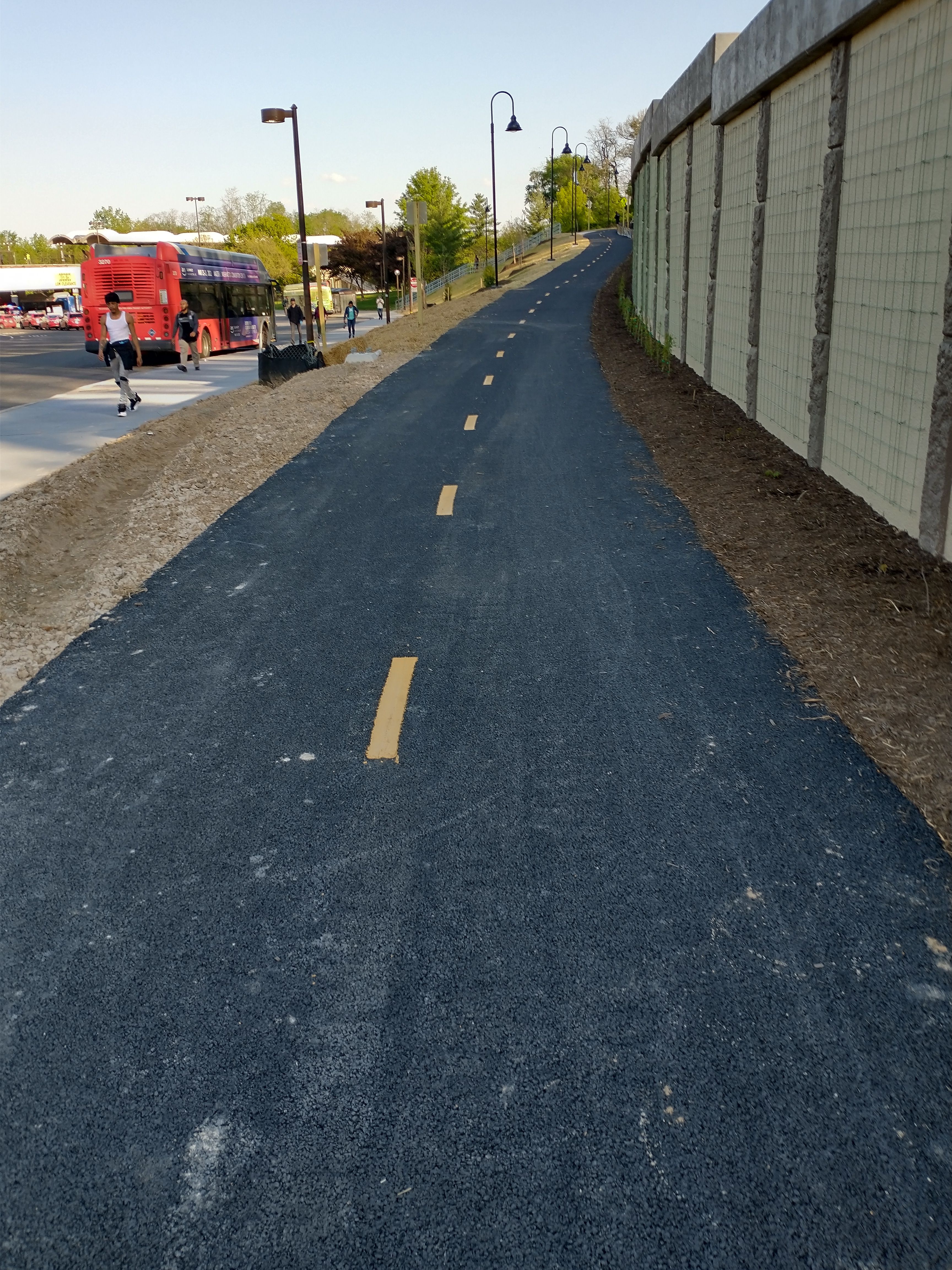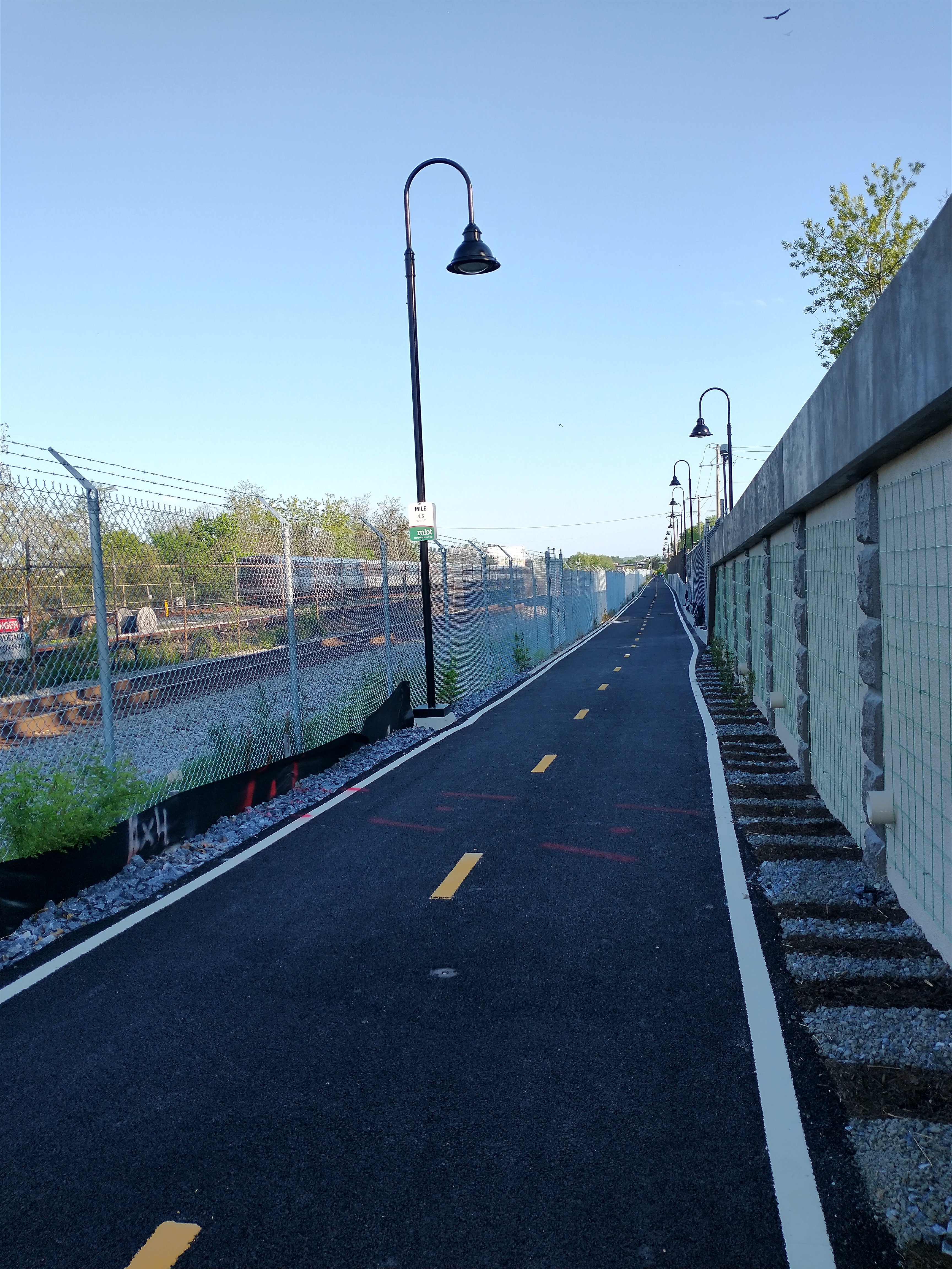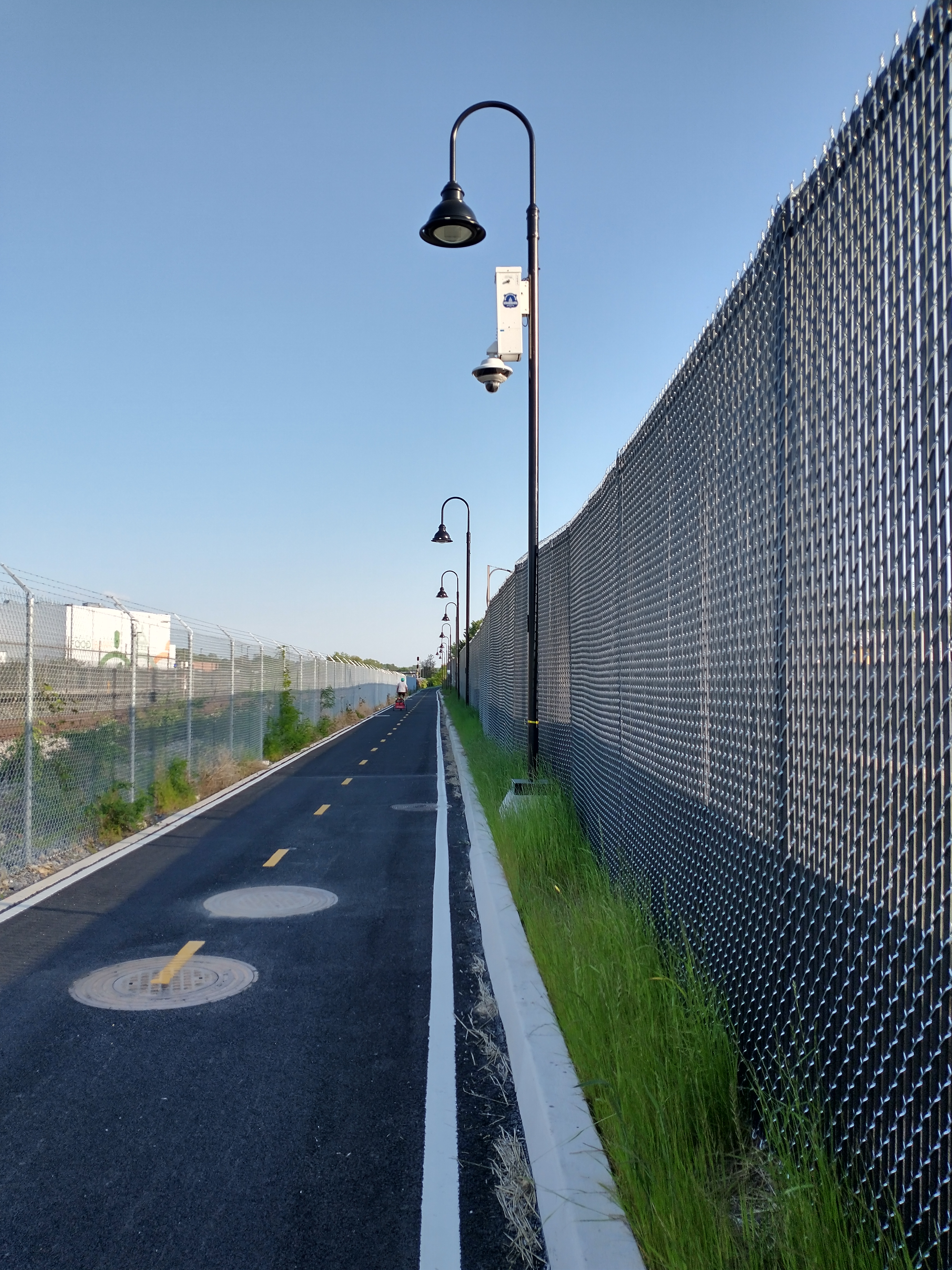 I walked the trail earlier this week after work one evening. There are a few police cameras at regular intervals along this short extension, including one near the pedestrian staircase by Fort Totten Metro station. It seems like if there is an emergency on this portion of the trail, emergency vehicles should be able to easily pinpoint where the emergency is. I like the gooseneck lights and the treatment of the retaining wall near the northern part of the extension. I also like the fence treatment by the concrete plant which serves a dual purpose in screening the plant from the trail but also reducing the glare from the sun. Also, once the native plants get established, it should all be quite lovely.