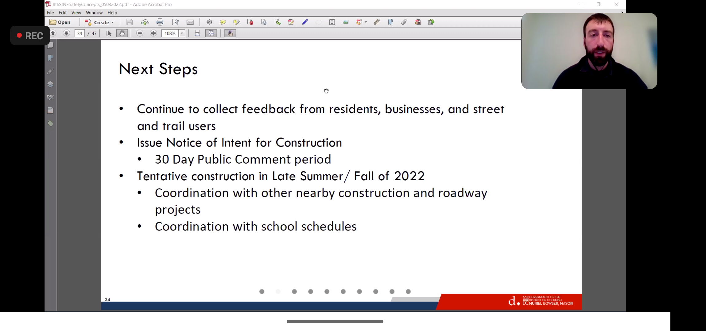 A couple of residents chimed in to repeat concerns about the planned on-street portions of the trail, especially on 1st Street NE. One resident noted that DC Bilingual is currently undergoing plans to expand enrollment at the school. The resident thinks that there will be a lot more traffic along 1st Street that will not necessarily be mitigated by expedited installation of a traffic signal at 1st Street and Riggs Road.