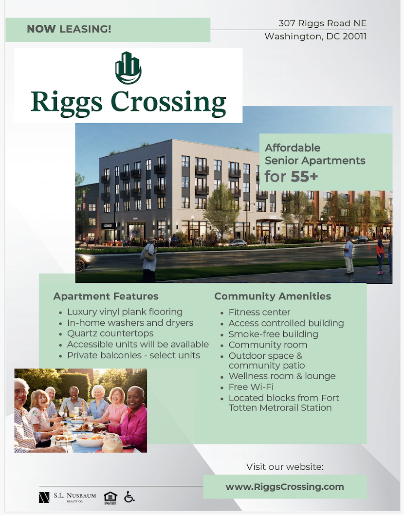 Riggs Crossing Senior Residences, a 55+ apartment community at 307 Riggs Road NE, still has affordable units available.