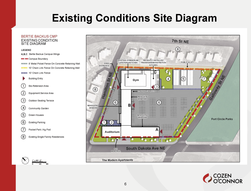 The existing campus, located at 5171 South Dakota Avenue NE, sits on a large city block along South Dakota Avenue between Galloway and Hamilton streets. The campus houses UDC’s community college programs (which were relocated from the university’s North Capitol Street campus) and UDC’s Bertie Backus food hub. There is also a DOES American Job Center located on the grounds with an entrance on Hamilton Street NE. The campus sits in ANC 5A01.