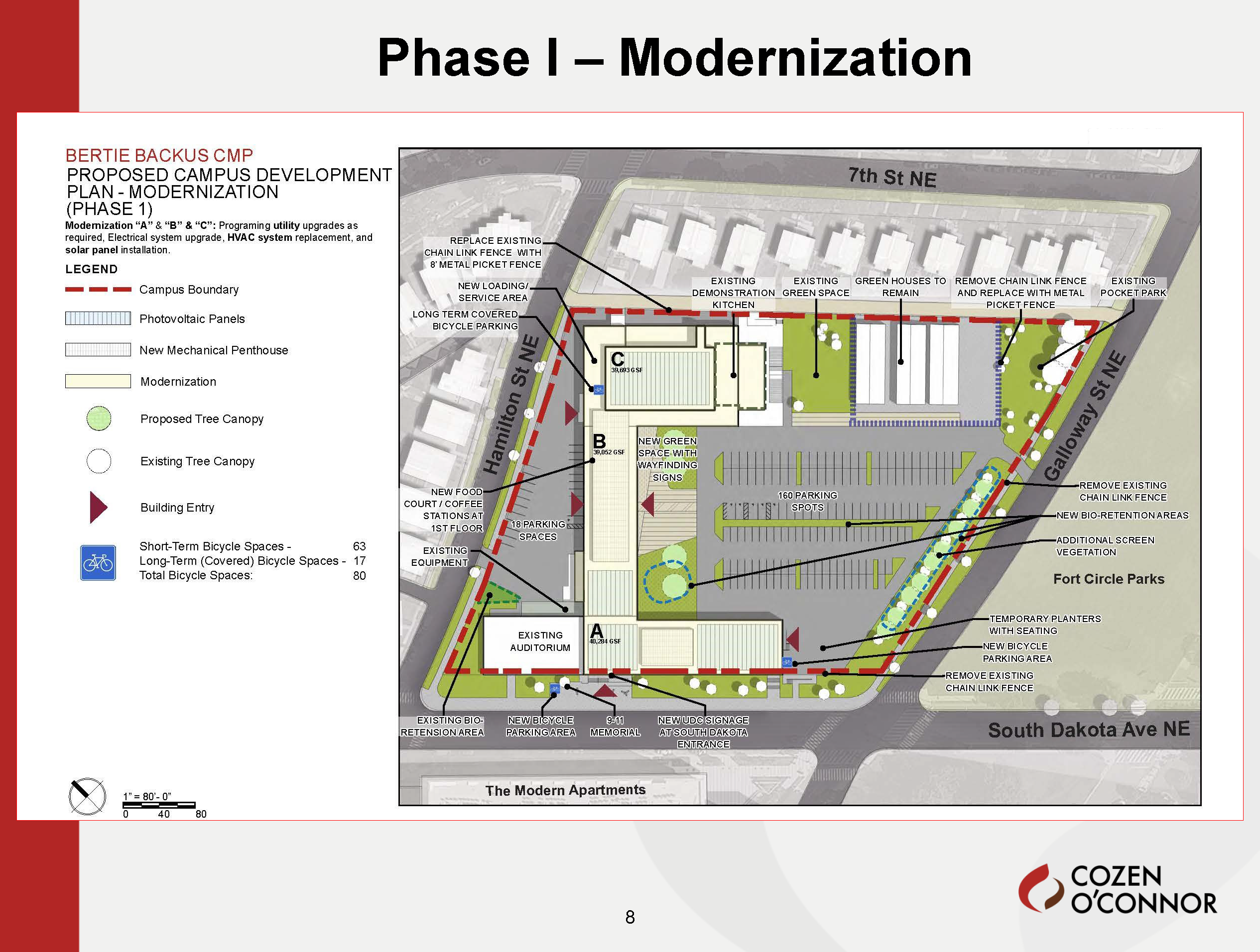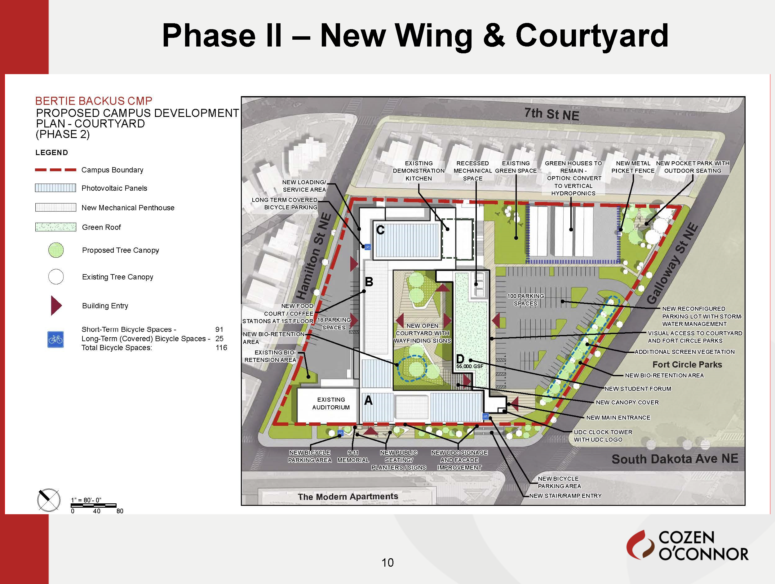 Phase 1 of the campus development plan will involve renovating the existing buildings on the campus. Phase 2 will involve constructing a new wing on the campus. Currently, there is not funding for Phase 2 activities. UDC will have to provide notice and return to the Zoning Commission before proceeding with construction of the new wing.