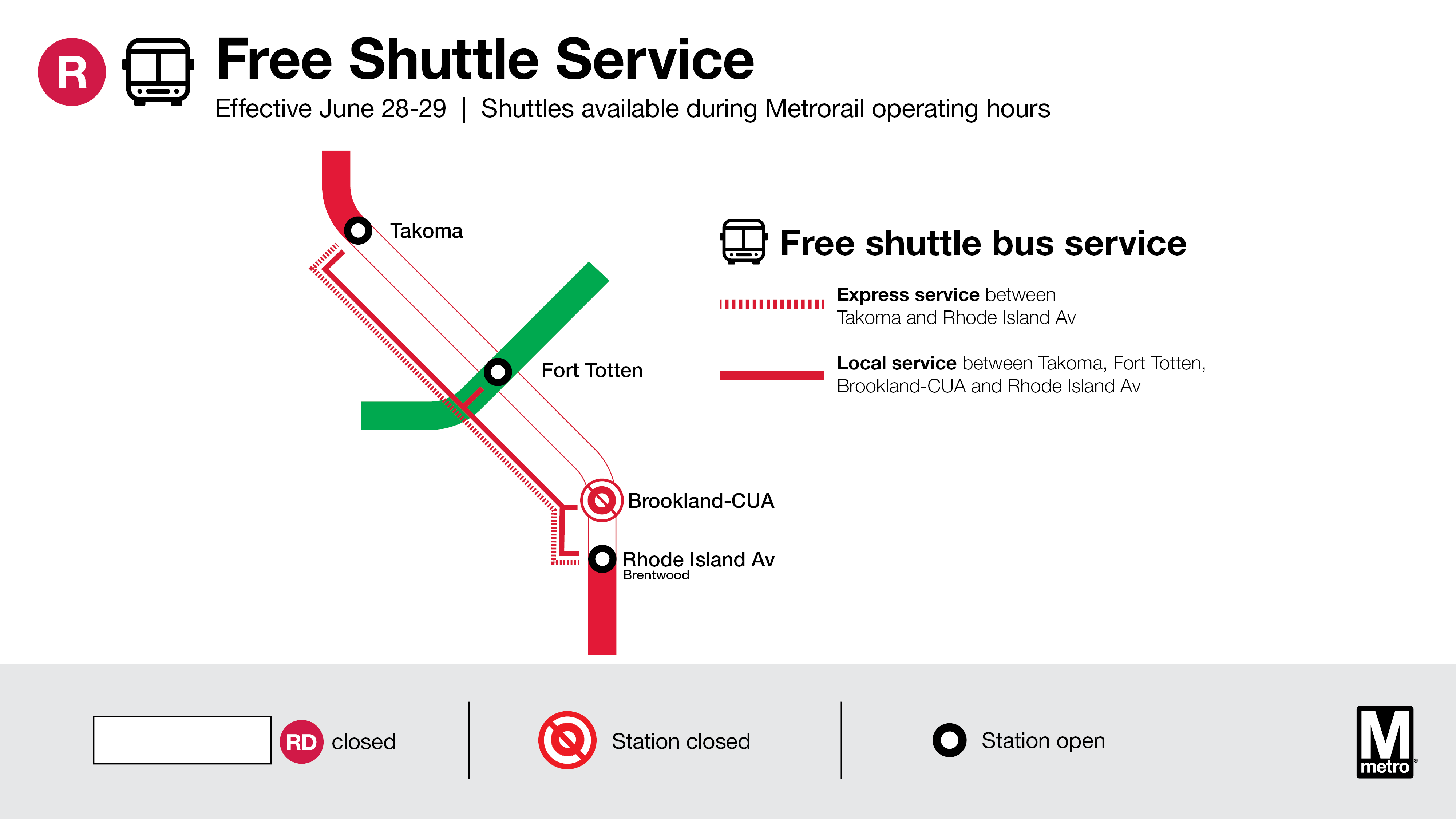 Free shuttle buses replace trains between Rhode Island Avenue and Takoma. No Red Line service at Fort Totten Station and Brookland-CUA Station closed. Normal Service frequencies between Shady Grove and Rhode Island Avenue stations and between Takoma and Glenmont stations.