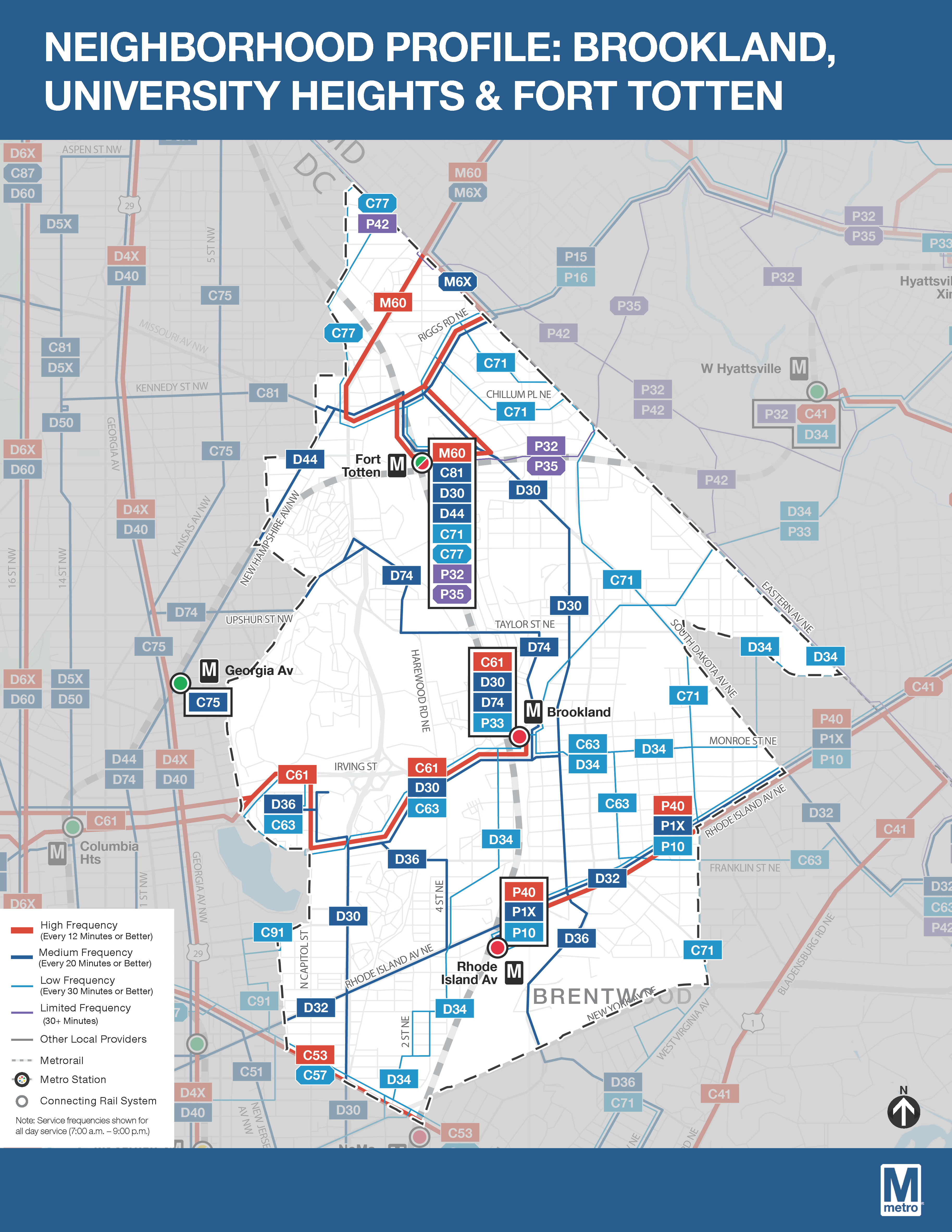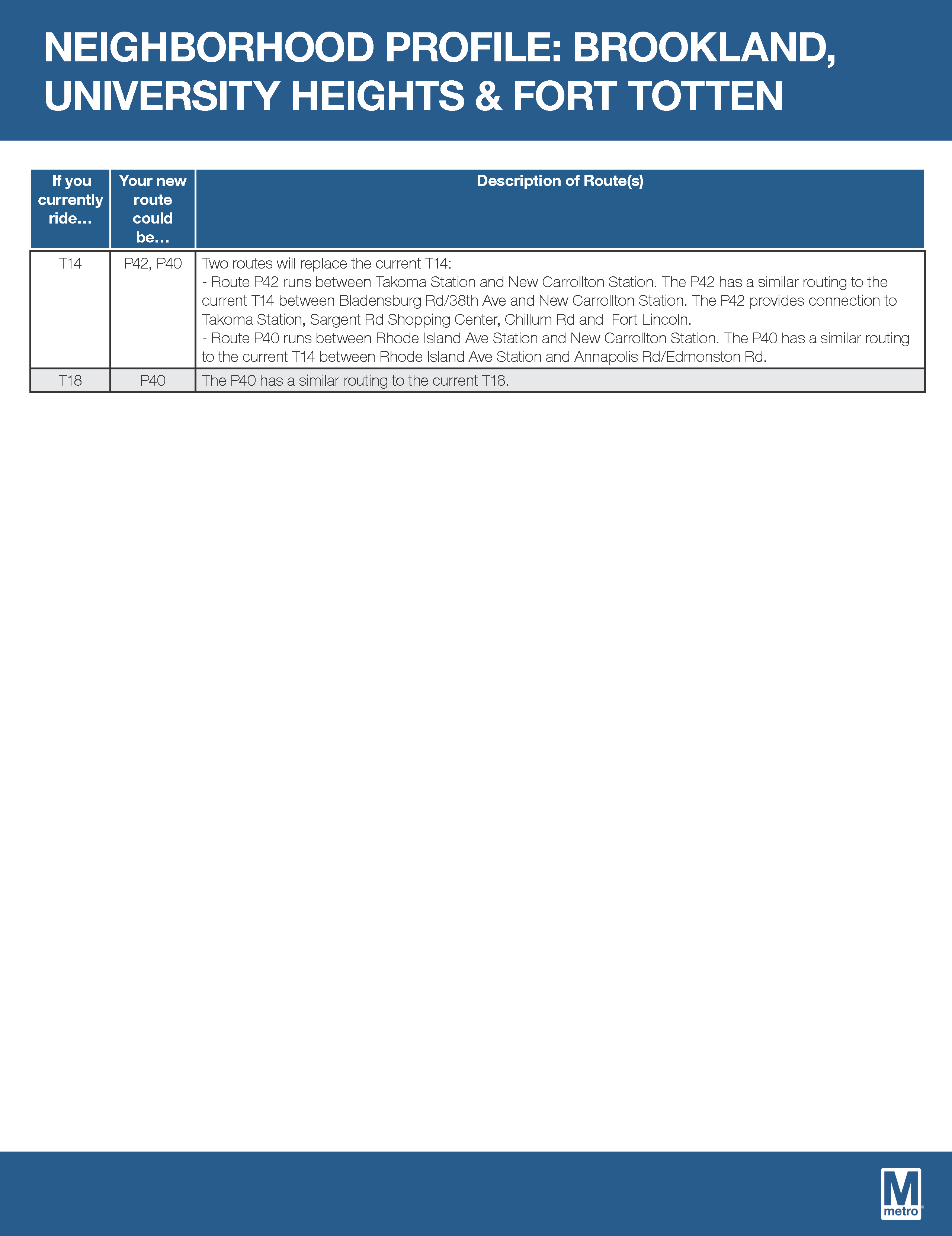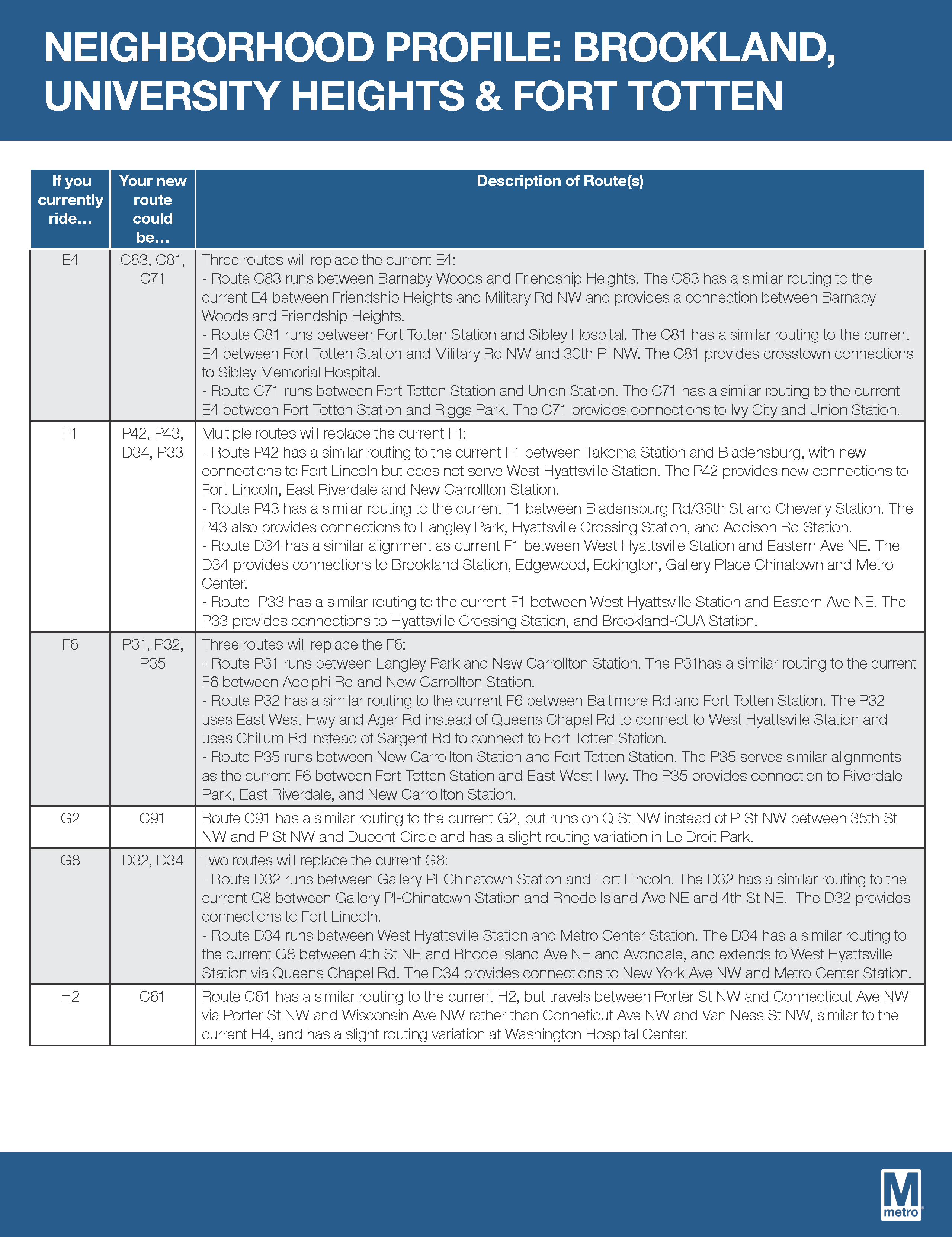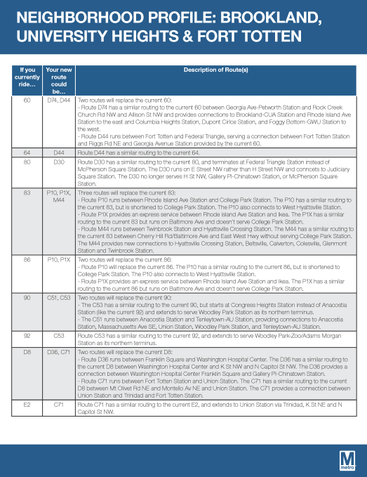 Metro has produced really handy neighborhood profiles, which provide a sort of crosswalk between existing routes and new routes. Routes serving the Riggs Park neighborhood are included in the Brookland, University Heights, & Fort Totten profile.