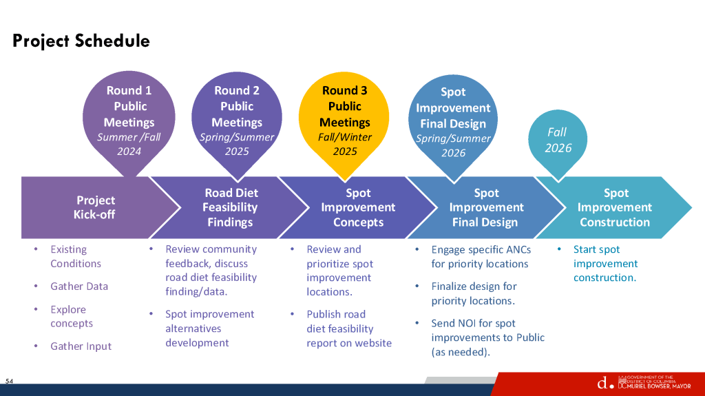 DDOT staff will provide an update on the progress of the study, present on the existing conditions and road diet feasibility, and go over spot improvement locations, concepts, and estimates. Attendees will have the opportunity to ask questions and engage directly with DDOT representatives.