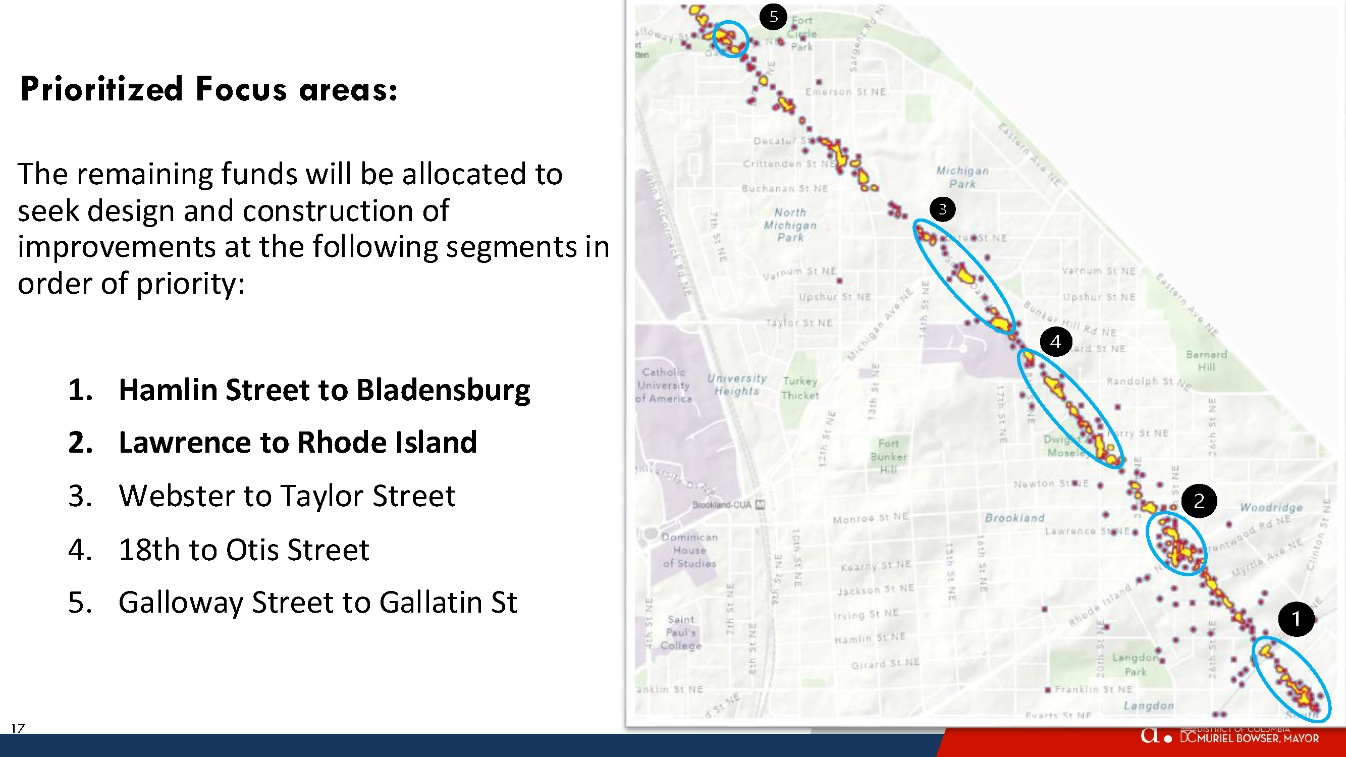 Galloway-Gallatin is the only location selected for spot treatment in this neck of the woods. DDOT did not plan to address anything on the northern end, but then Galloway received the most comments and Riggs Road received the second highest number of comments. So DDOT decided to put Galloway-Gallatin at the bottom of the priority list. Everyone, including DDOT, knows that Riggs is a problem but they say that addressing Riggs & South Dakota would be a very capital intensive project that would need support from the Ward 4 councilmember.