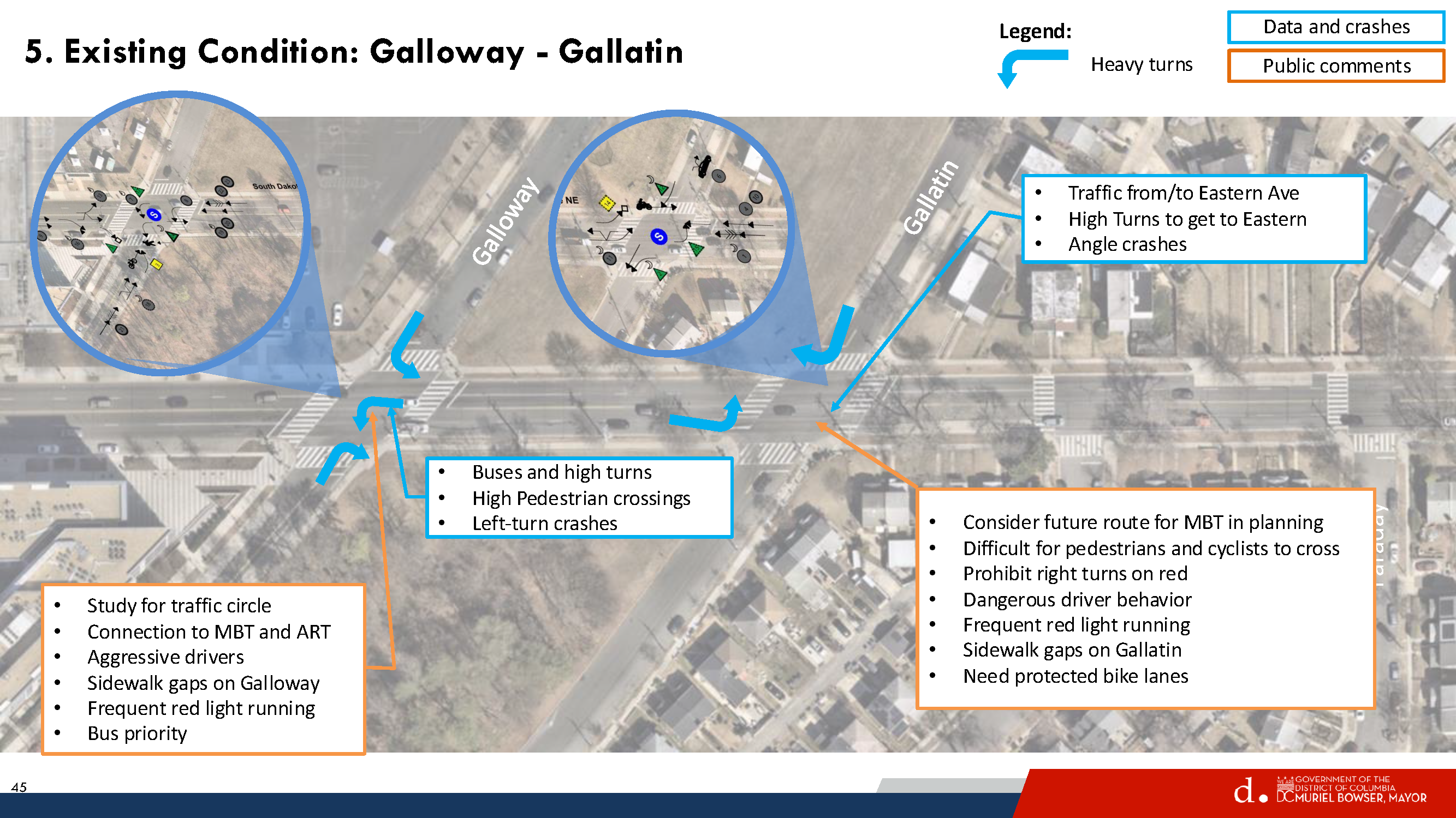 Residents are familiar with existing problems at South Dakota/Galloway and at South Dakota/Gallatin. Galloway gets a lot of traffic. It leads to the Fort Totten station and the Metropolitan Branch Trail, so lots of cars, buses, pedestrians, and people on bikes. The station is a major bus transfer point and lots of students use the station to get to nearby UDC and charter schools or to get on buses to go to schools outside the neighborhood. Gallatin sees less traffic than Galloway, but still gets a fair amount. And Gallatin is envisioned as a future connection to bike trails in Prince George’s County.