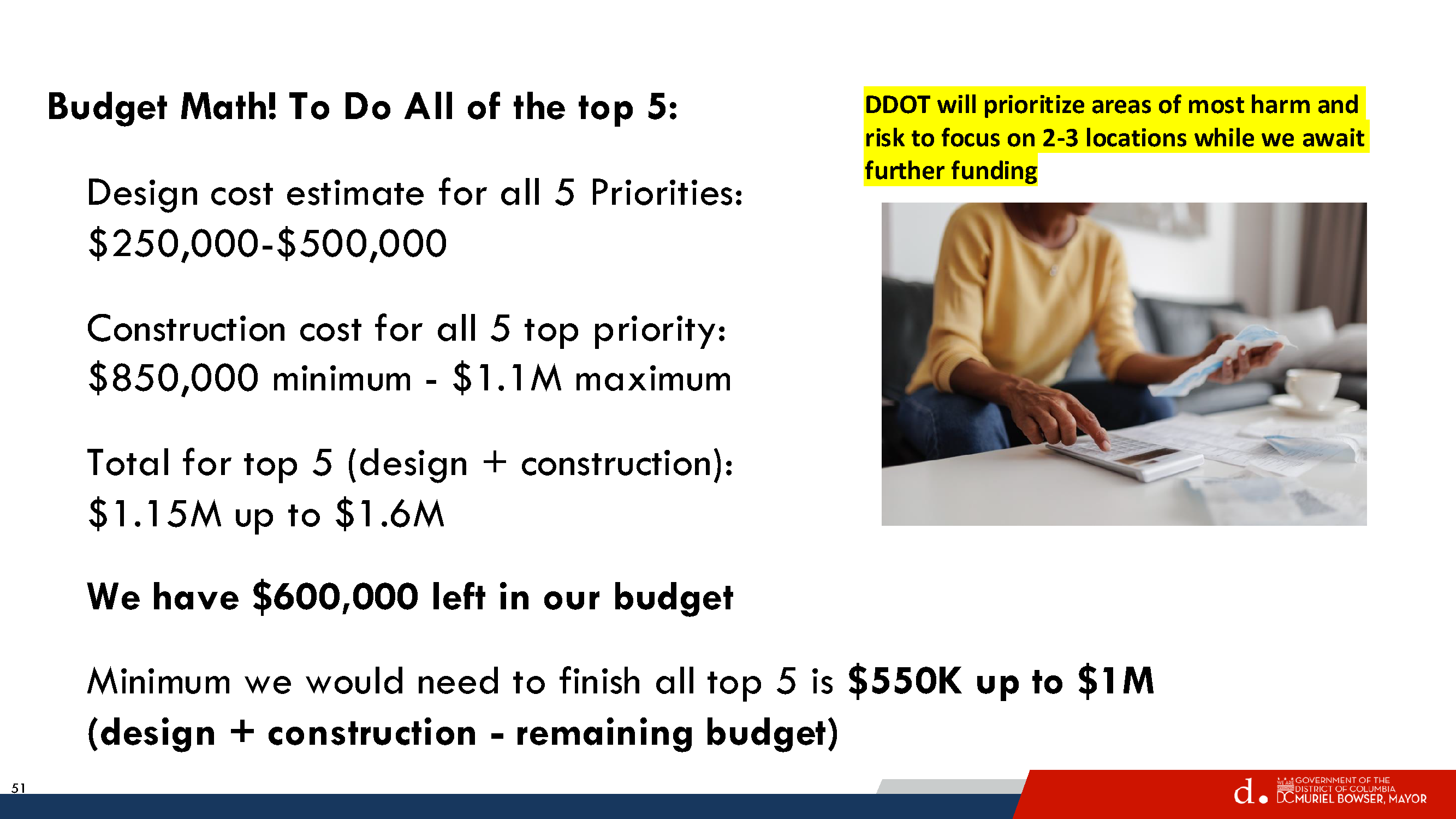 DDOT discussed the costs of common treatments. A full traffic signal costs $300,000. Markings signs, and side street safety treatments can cost $10,000- $50,000 per intersection. Concrete improvements can start at $50k for a curb extensions or median island. So if DDOT puts a traffic signal at one of the intersections, that will use up half of the $600,000 budget for spot treatments. DDOT shared all of this to manage expectations and to emphasize that there will be tradeoffs depending on what is most important to residents.